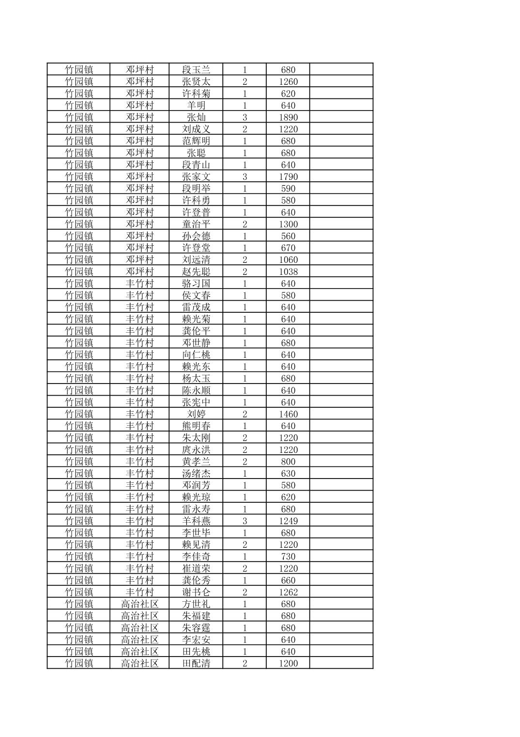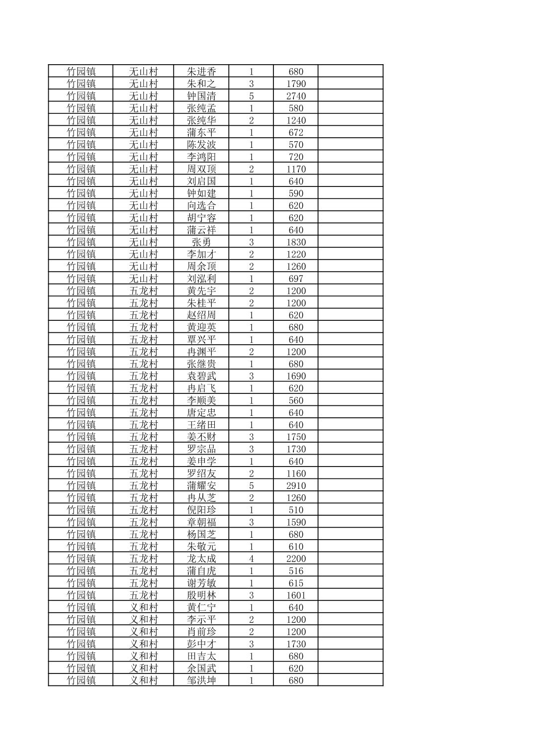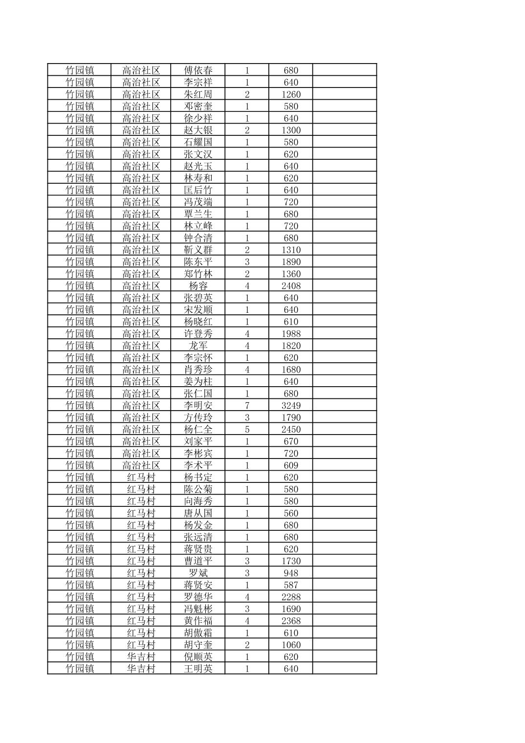 奉节县竹园镇2025年9月份农村低保家庭保障金发放花名册