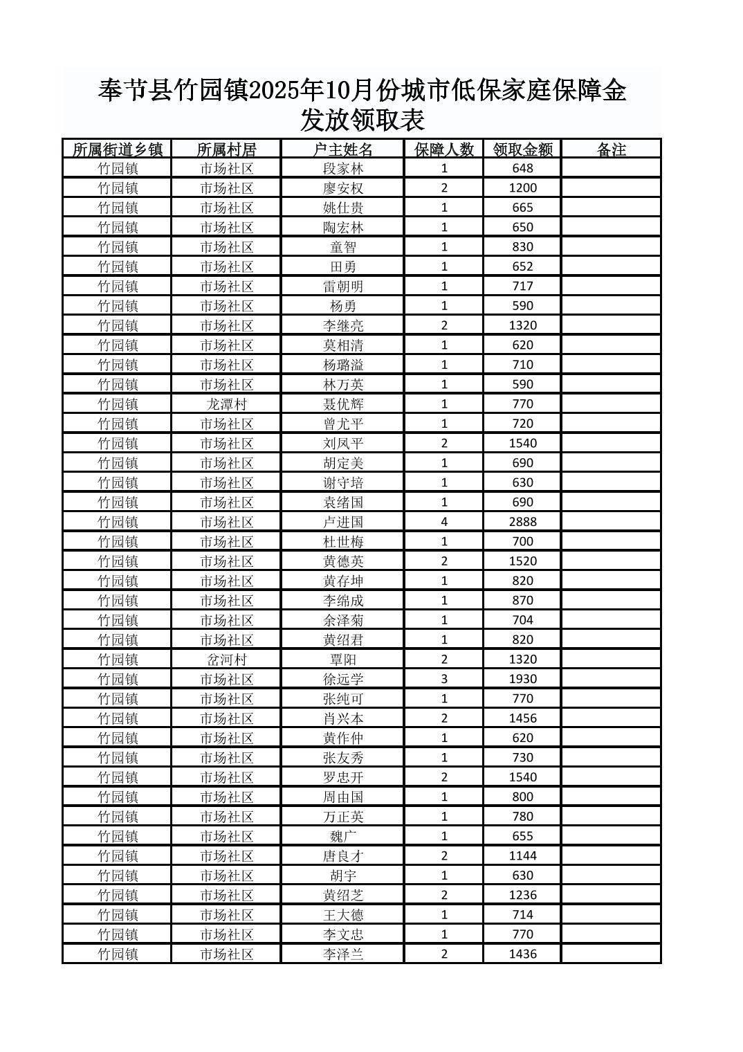 奉节县竹园镇2025年10月份城市低保家庭保障金发放领取