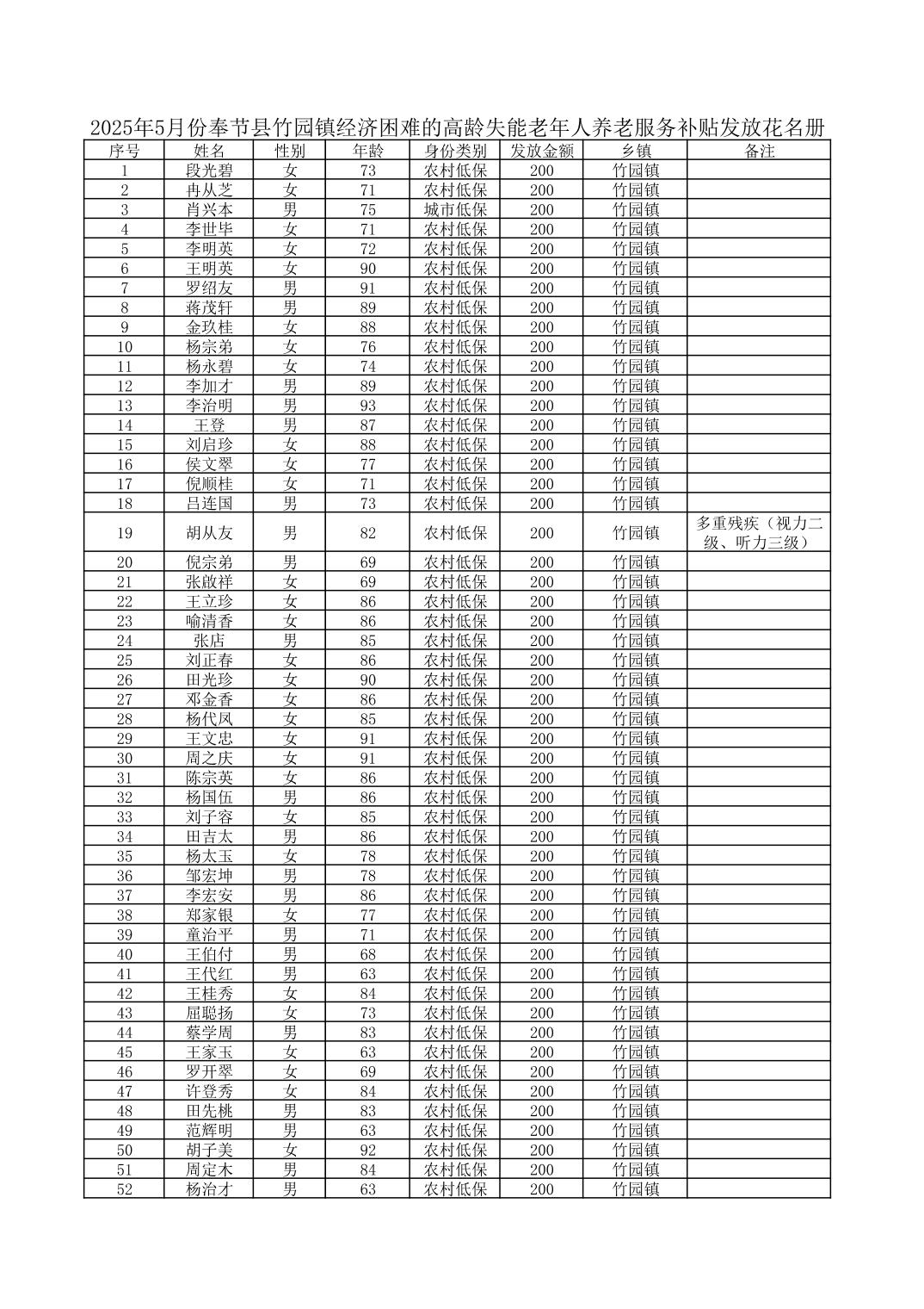 2025年5月份奉节县竹园镇经济困难的高龄失能老年人养老服务补贴发放花名册