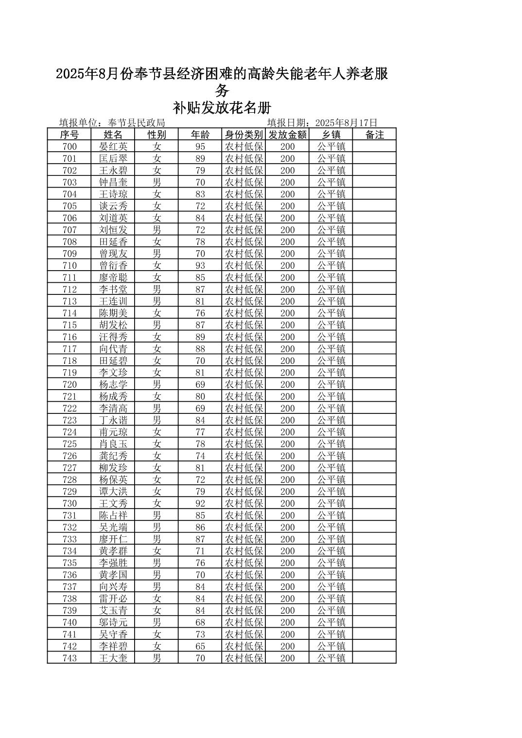 2025年8月份奉节县经济困难的高龄失能老年人养老服务补贴发放花名册
