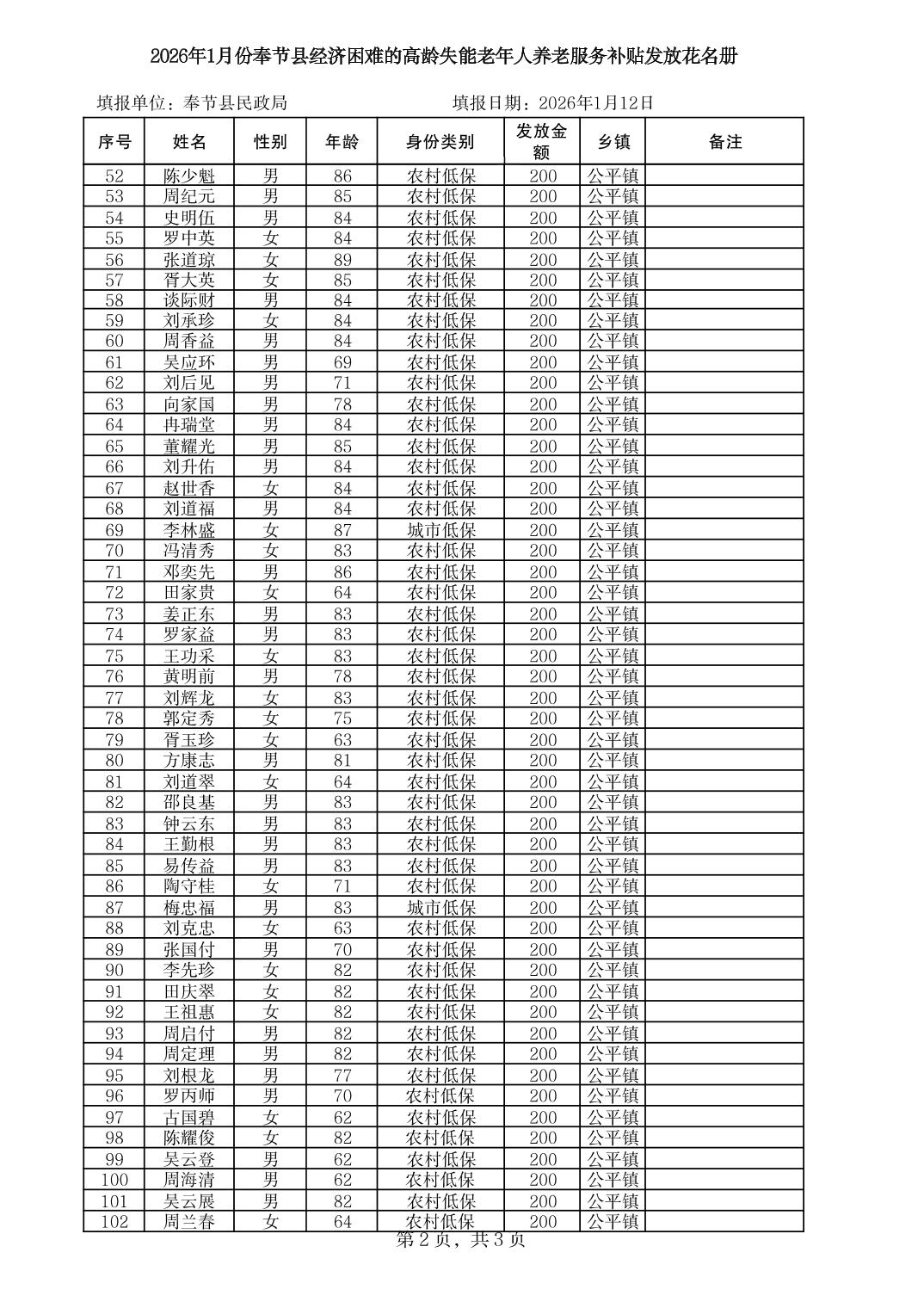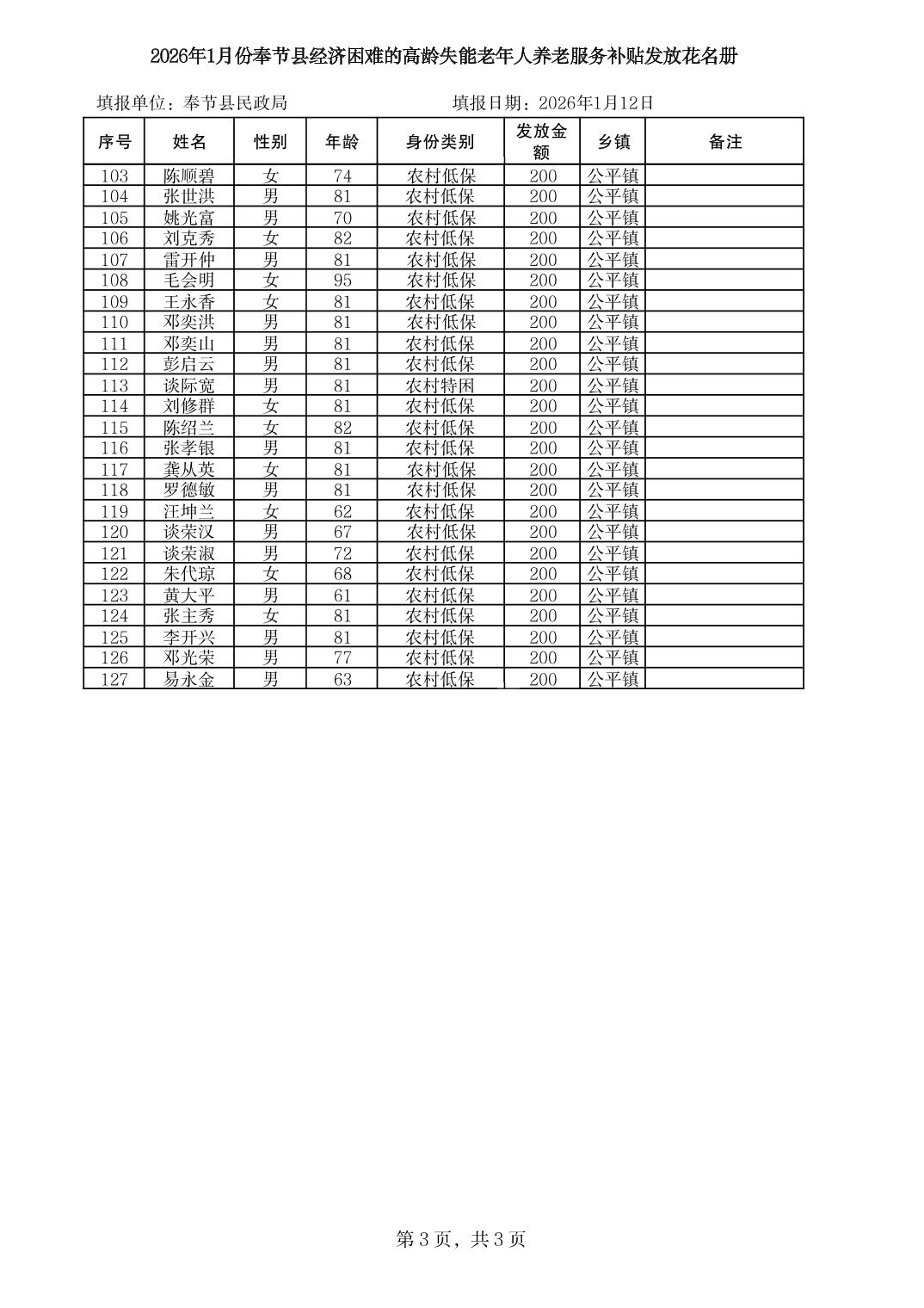 2026年1月份奉节县公平镇经济困难的高龄失能老年人养老服务补贴发放花名册