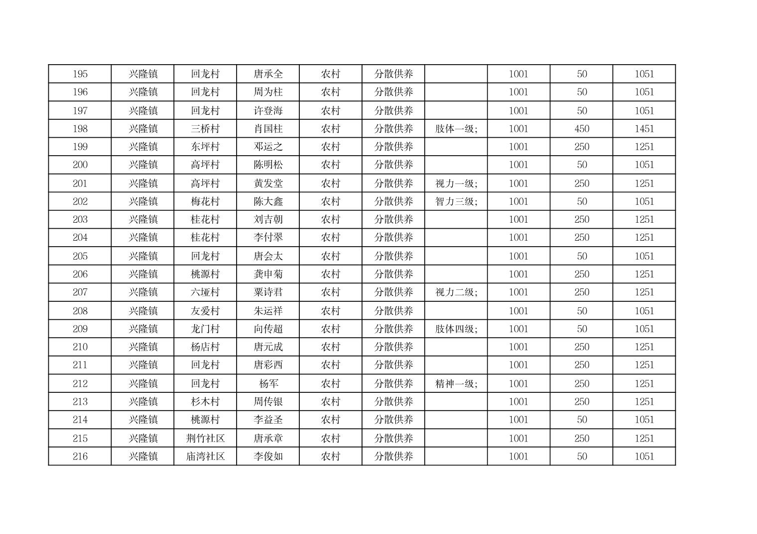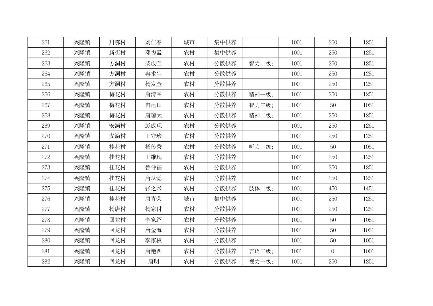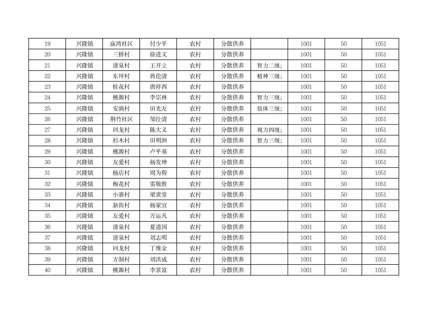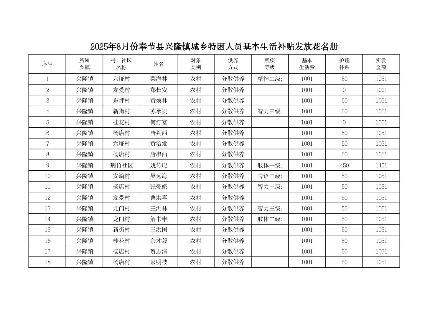 2025年8月份奉节县兴隆镇城乡特困人员基本生活补贴发放花名册