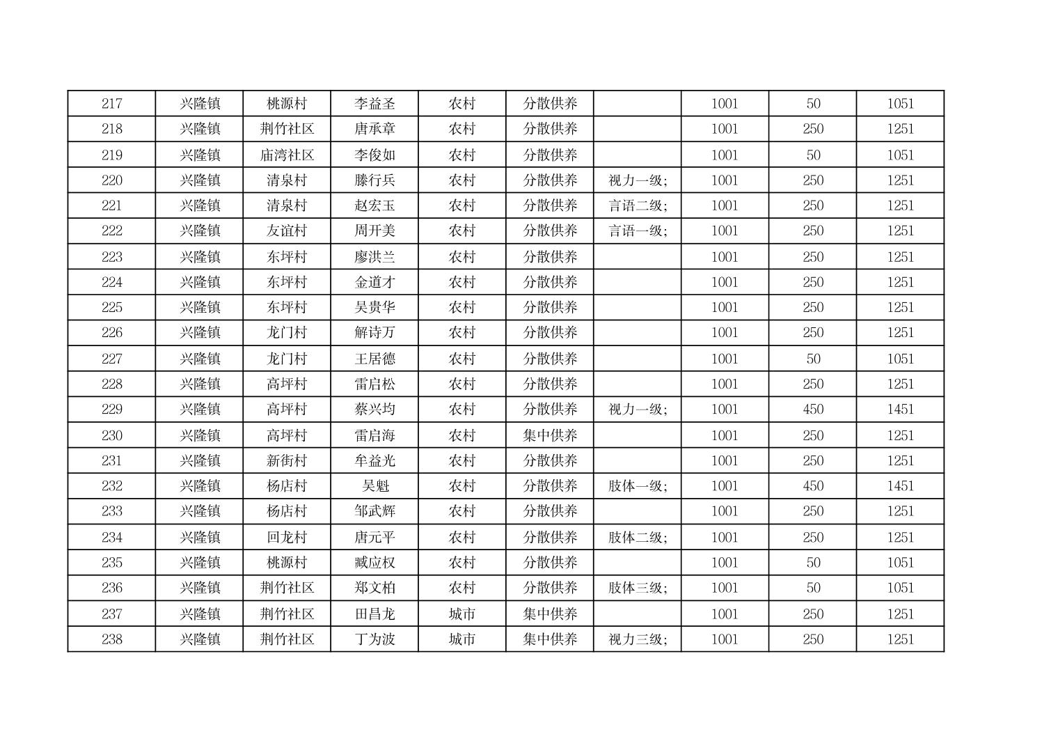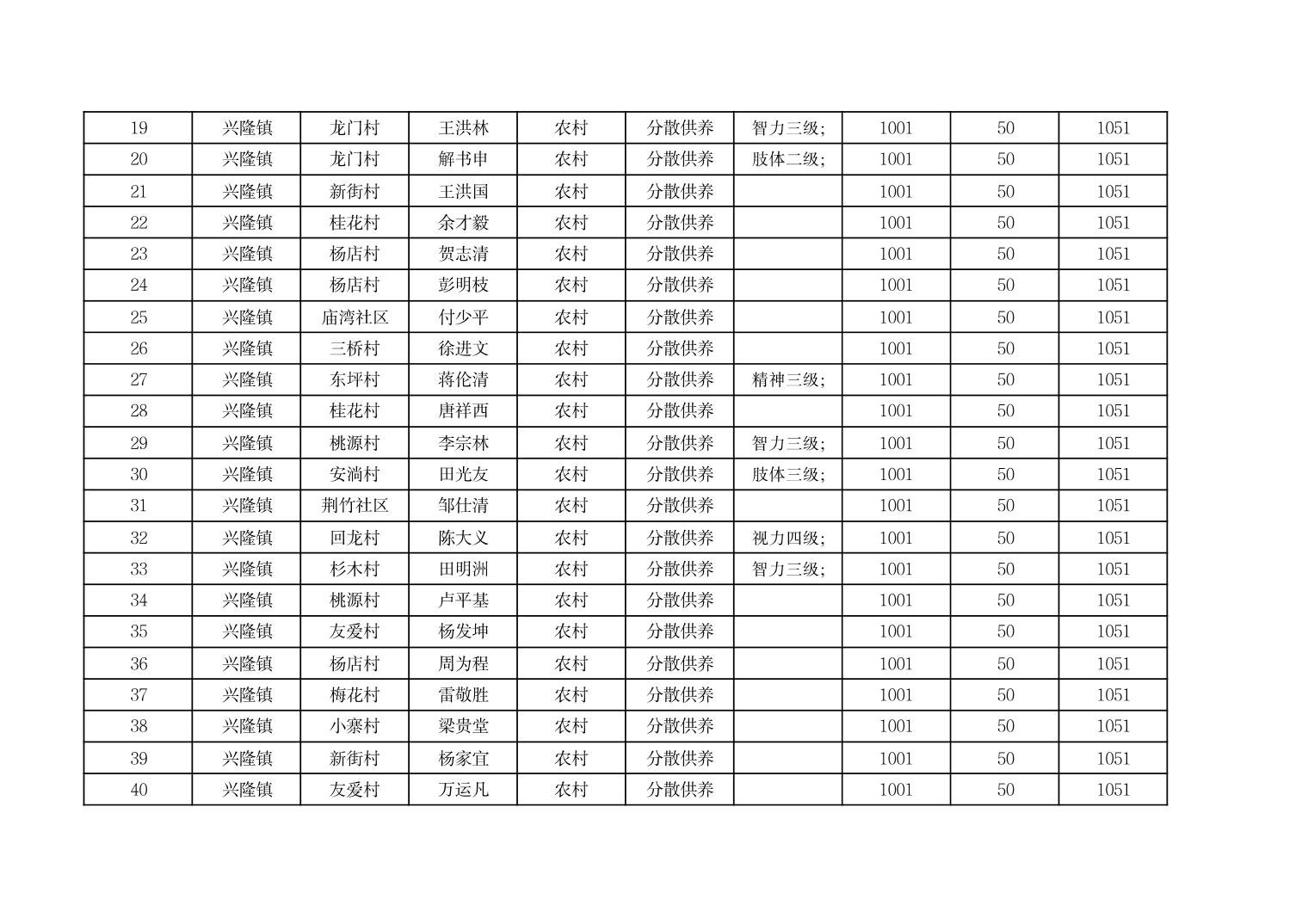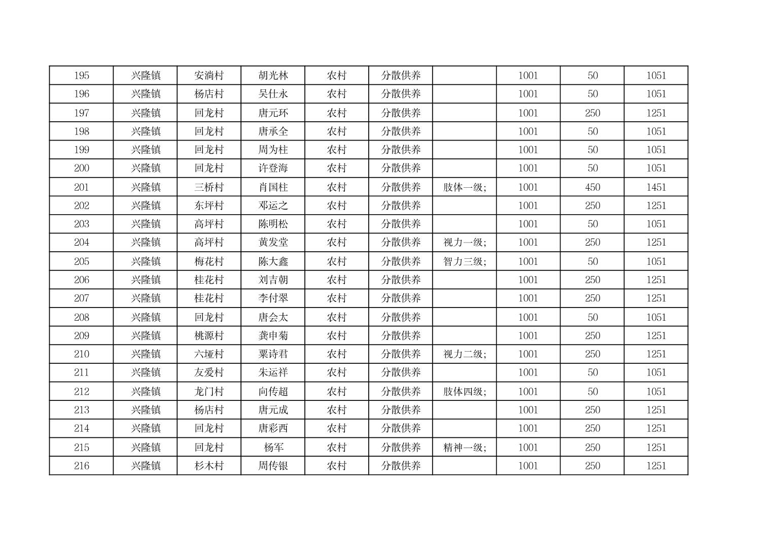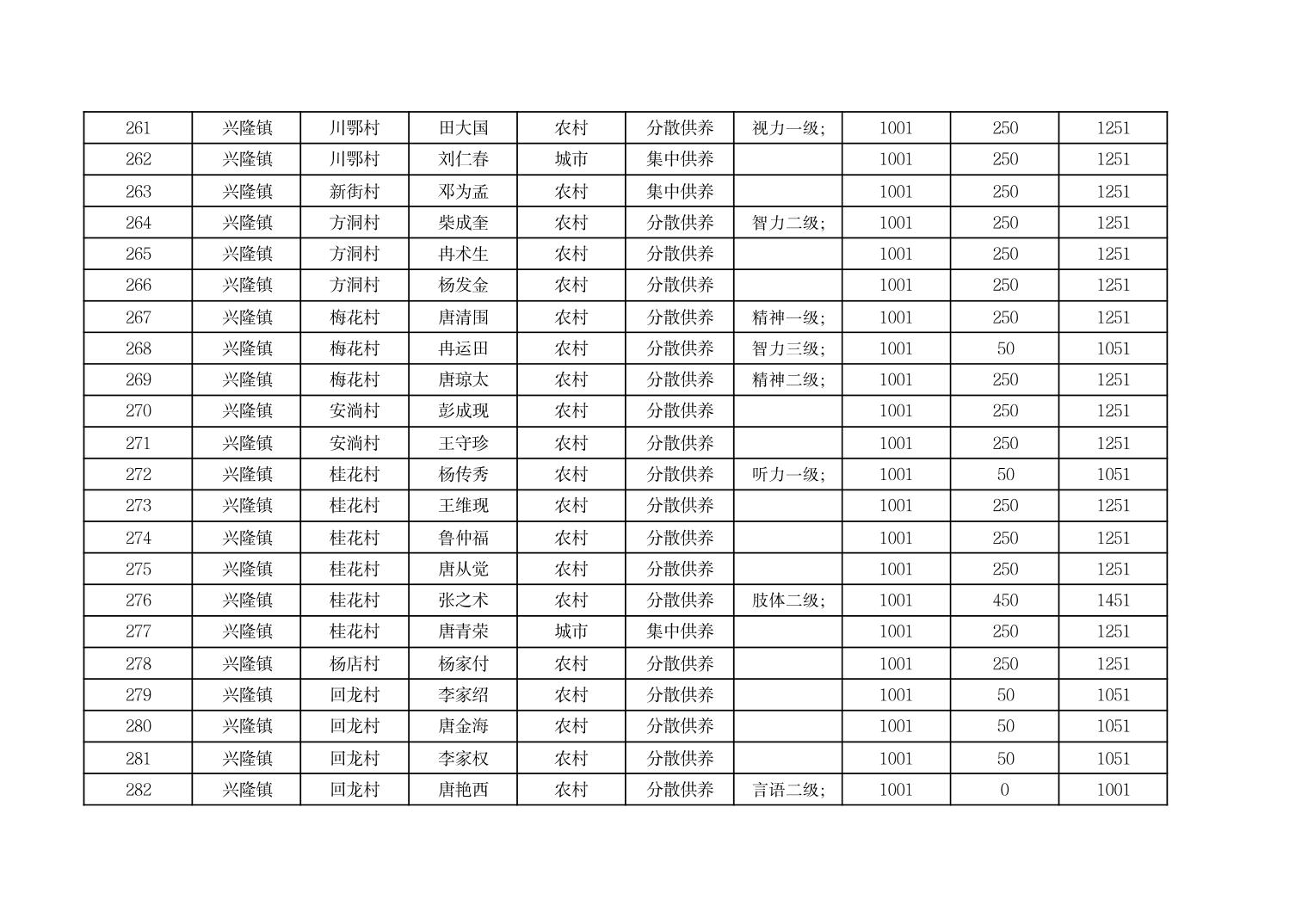 2025年9月份奉节县兴隆镇城乡特困人员基本生活补贴发放花名册