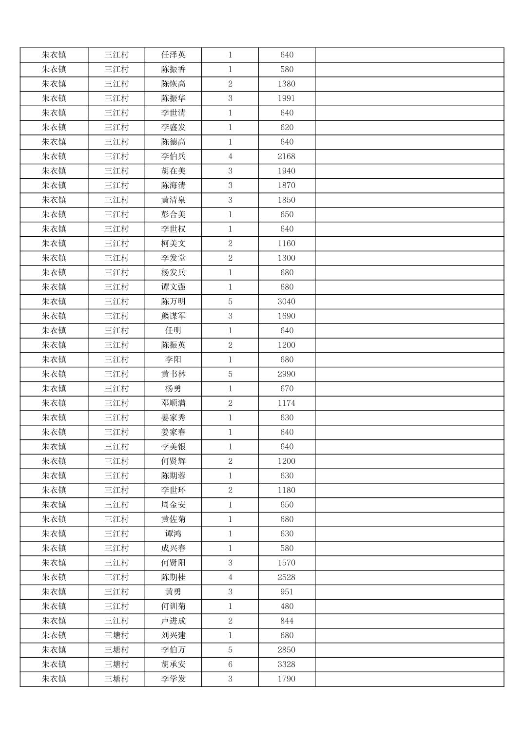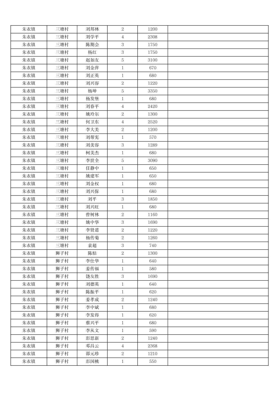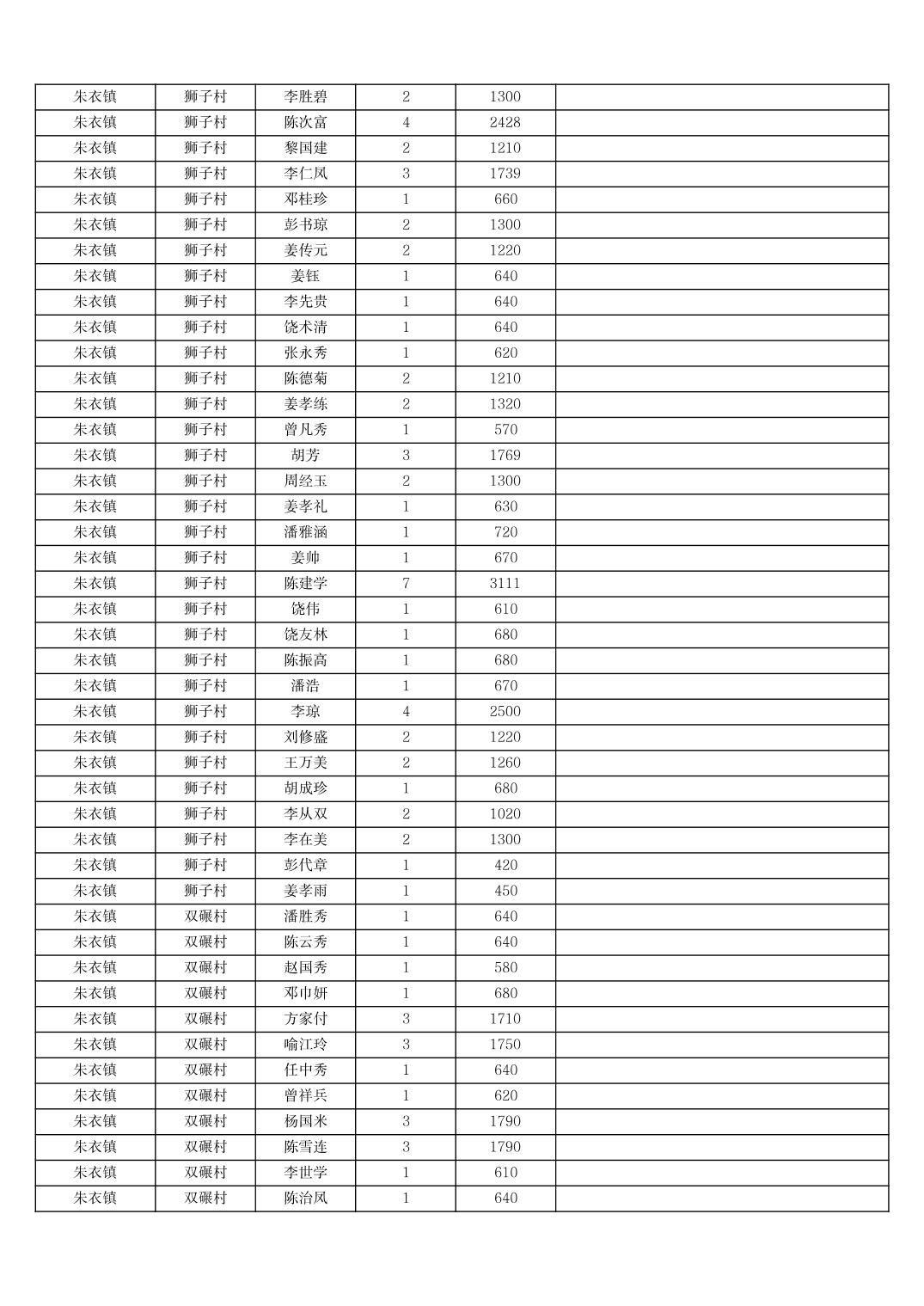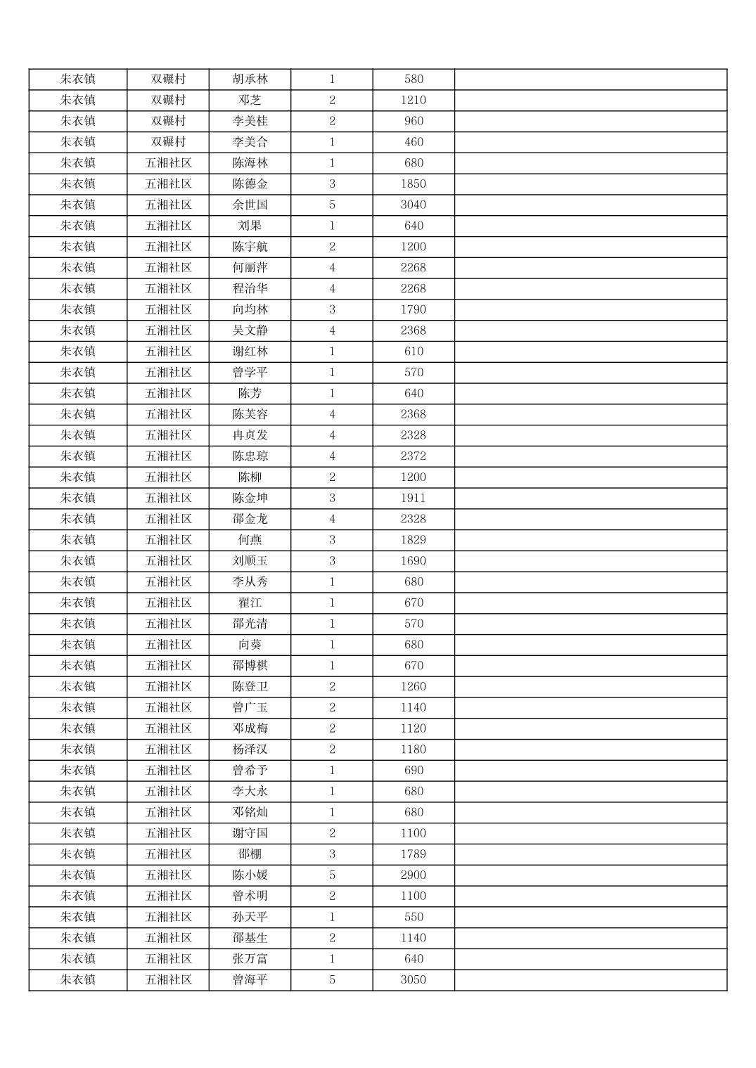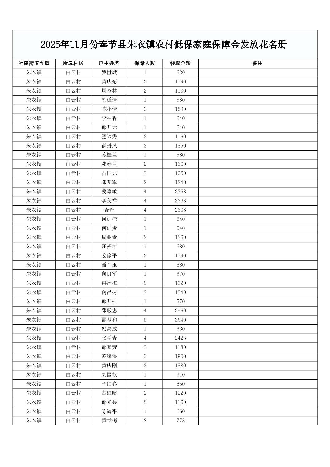 2025年11月份奉节县朱衣镇农村低保家庭保障金发放花名册