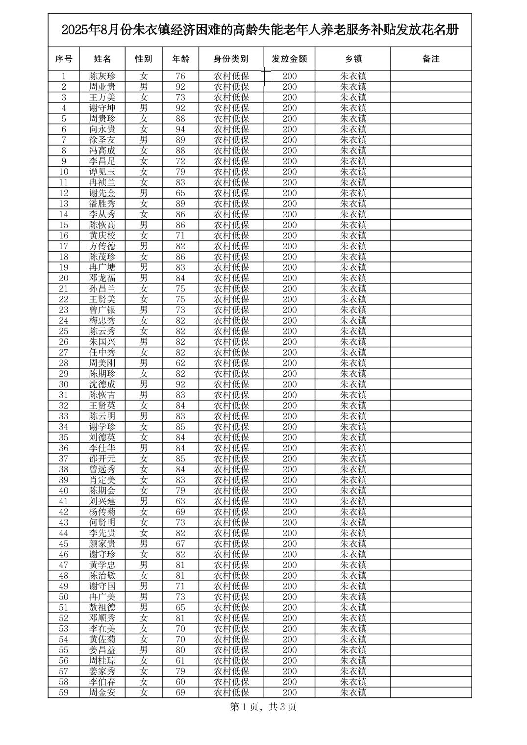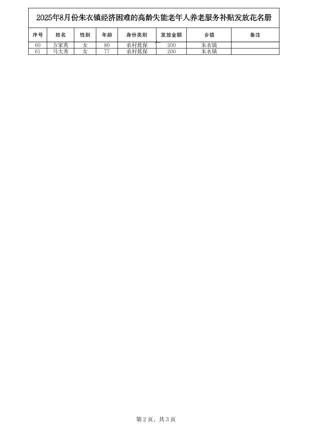 2025年8月份奉节县朱衣镇经济困难的高龄失能老年人养老服务补贴发放花名册