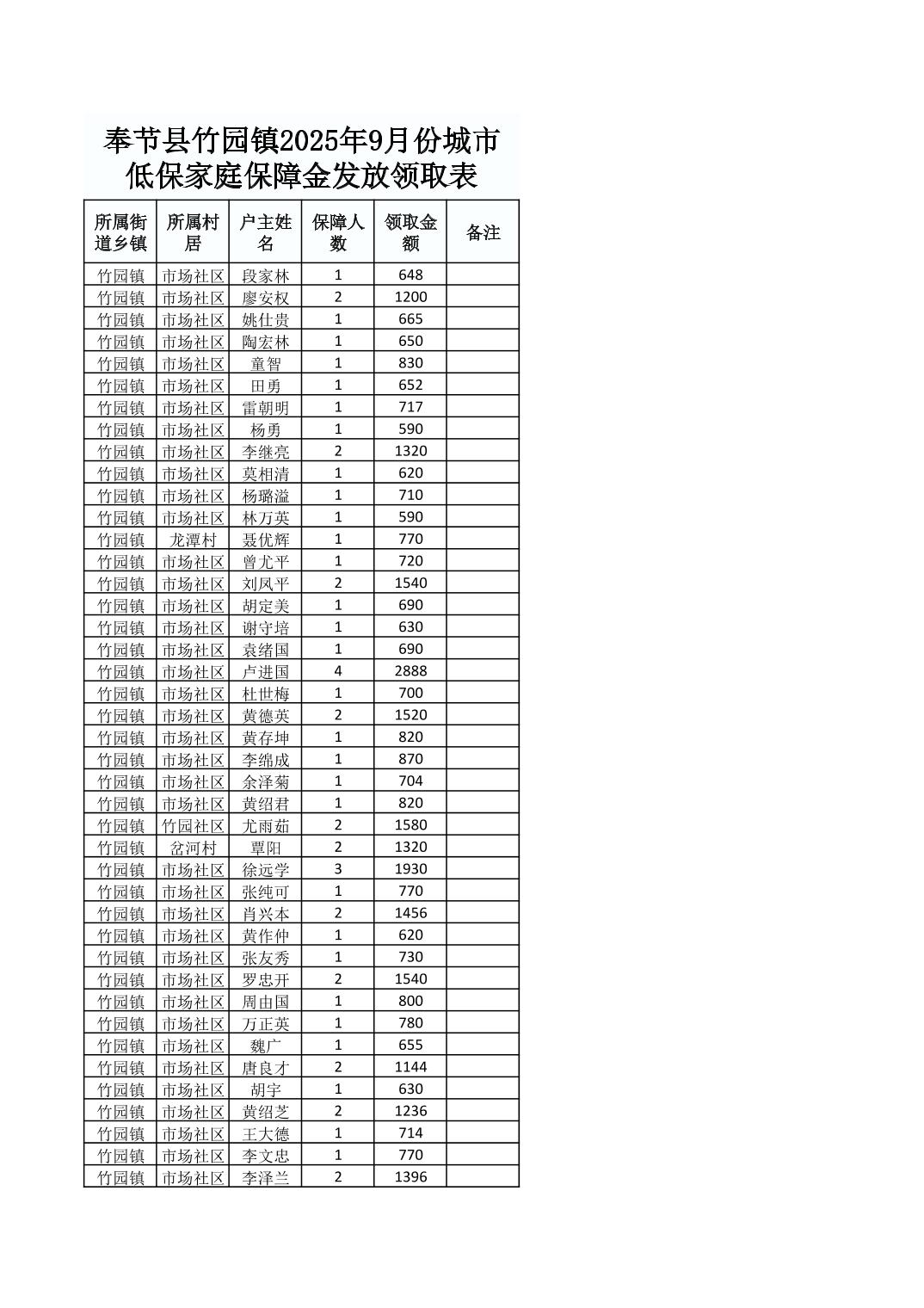 奉节县竹园镇2025年9月份城市低保家庭保障金发放领取表