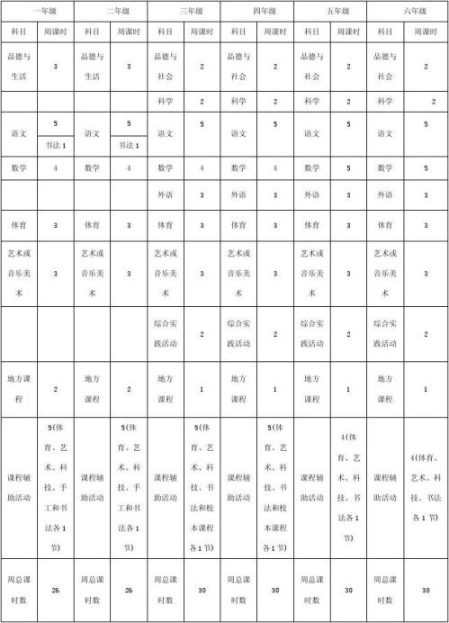 备注:义务教育阶段健康教育每周在体育课中安排0.5课时;环境教育每3周在地方课程中安排1课时;安全与法制教育每周在地方课程或品德与生活、品德与社会、思想品德课中安排0.5课时。
