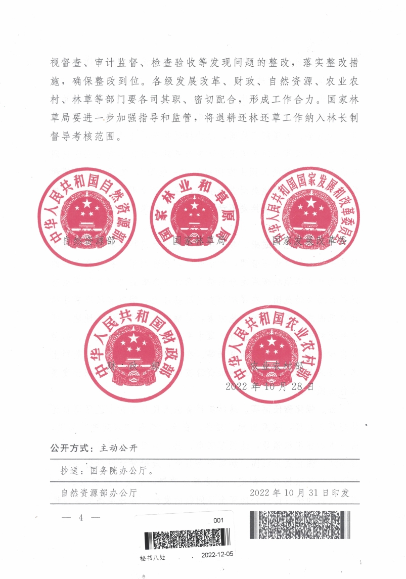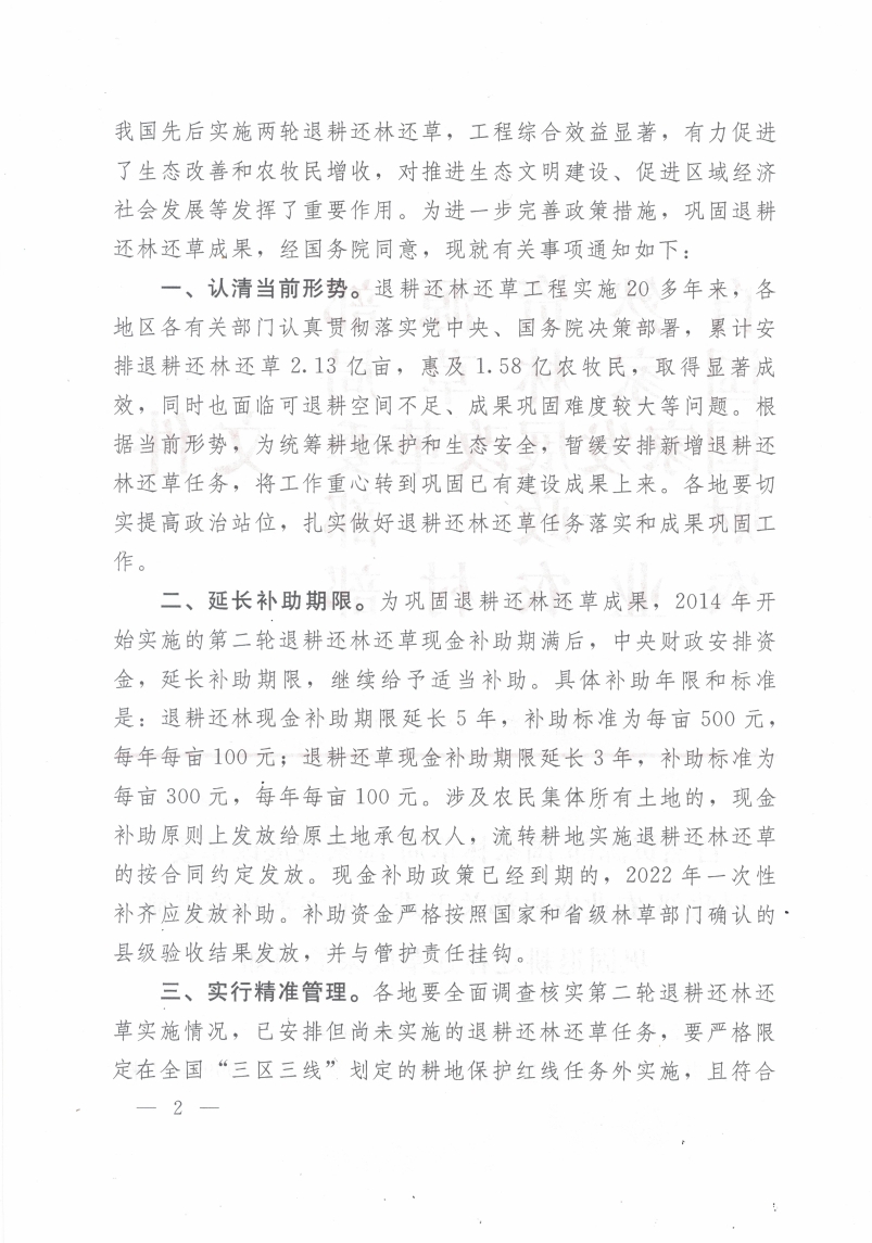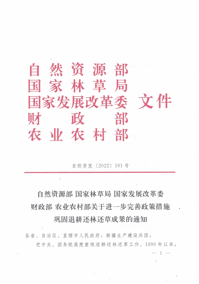 新一轮退耕延长补助政策〔2022〕191号 自然资源部、国家林草局、国家发展改革委、财政部、农业农村部关于进一步完善政策措施巩固退耕还林还草成果的通知