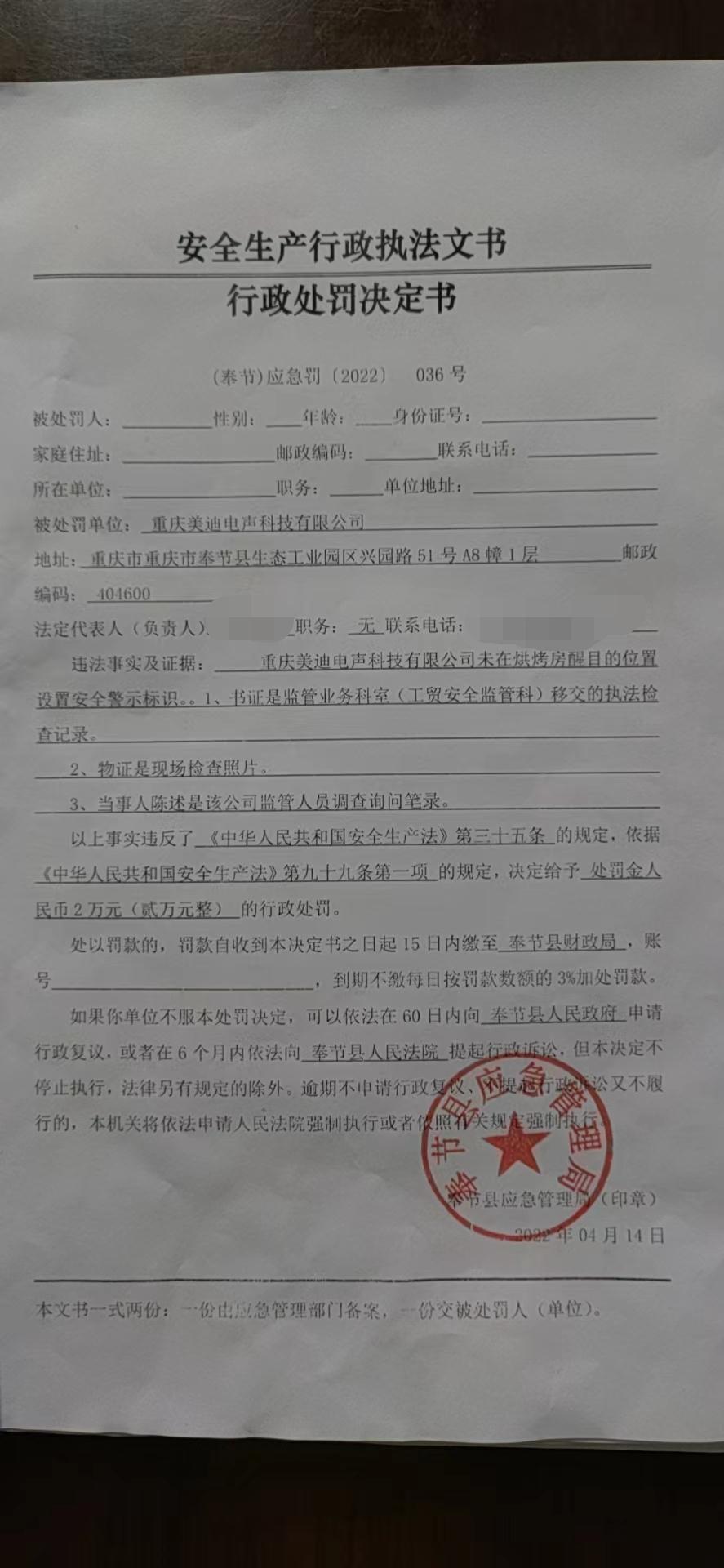 行政处罚决定书(重庆美迪电声科技有限公司)