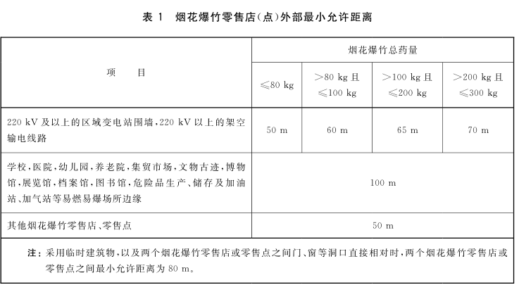 零售场所选址布局要严格按照《烟花爆竹零售店(点)安全技术规范》(AQ4128—2019)的相关要求进行;选址的外部最小距离应符合表1的规定,还应符合GB50016等有关国家标准的规定,外部允许最小距离自烟花爆竹零售场所外墙或与其他场所隔墙外侧算起,专柜销售的自烟花爆竹零售场所与其他场所之间隔断外侧算起。