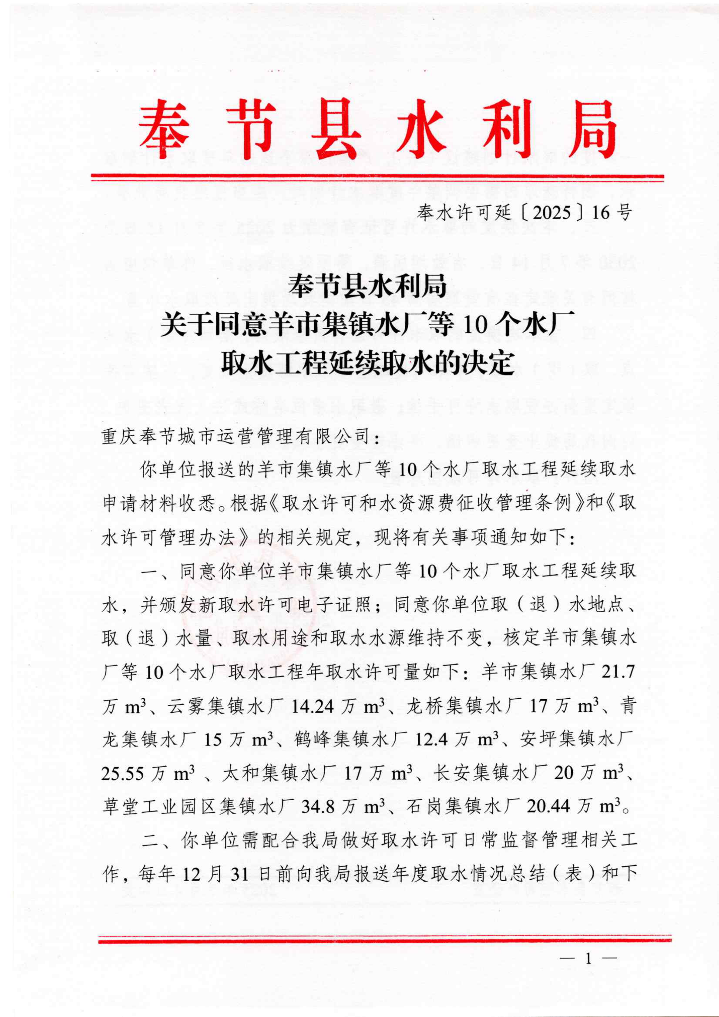 奉节县水利局关于同意羊市集镇水厂等10个水厂取水工程延续取水的决定
