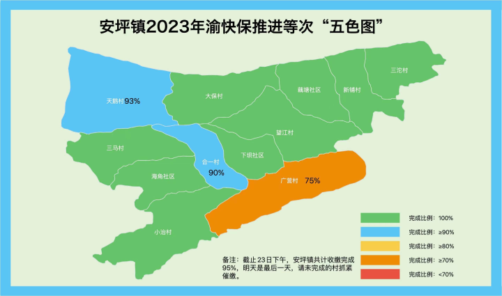 安坪镇以12个村(社区)党支部为中坚力量,集合网格(社)长、党员代表、群众代表,充分发挥“党建+网格”治理优势,通过“线上+线下”的宣传动员模式,确保将“重庆渝快保”宣推行动落到实处。线上通过公众号、微信群将“重庆渝快保”的政策背景、产品特色和保障范围进行宣传讲解;线下通过进格入户,一对一解决群众的疑惑和问题,手把手指导操作,切实让惠民深入人心、让便民落到实处。在考核督促方面,安坪镇借助“五色图”,使推进等次可视化,工作推进高效化。