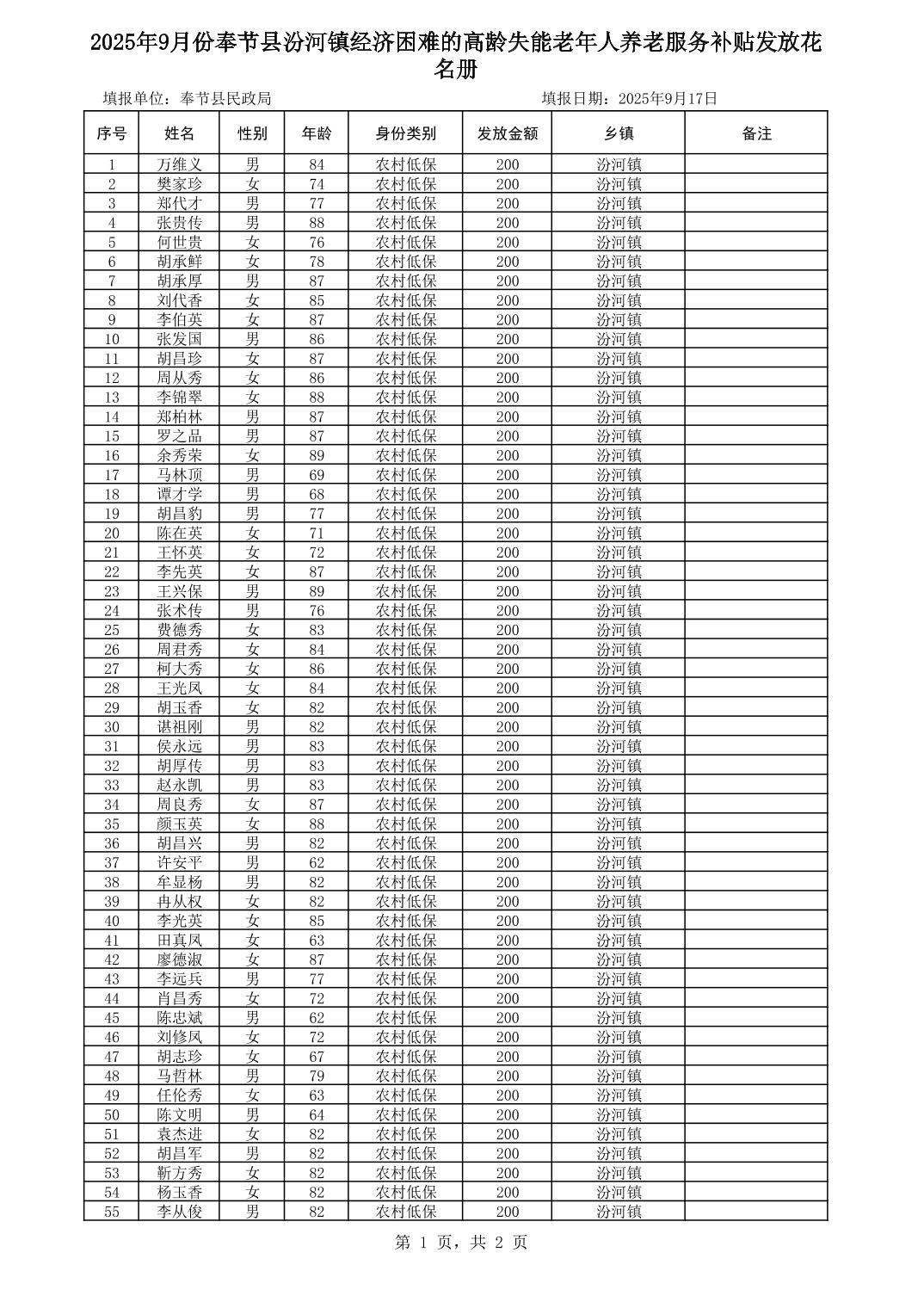 2025年9月份奉节县汾河镇经济困难的高龄失能老人养老服务补贴花名册