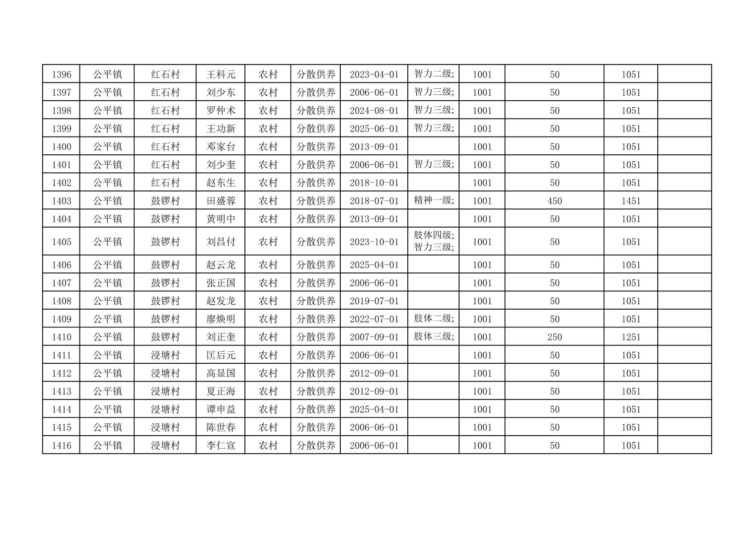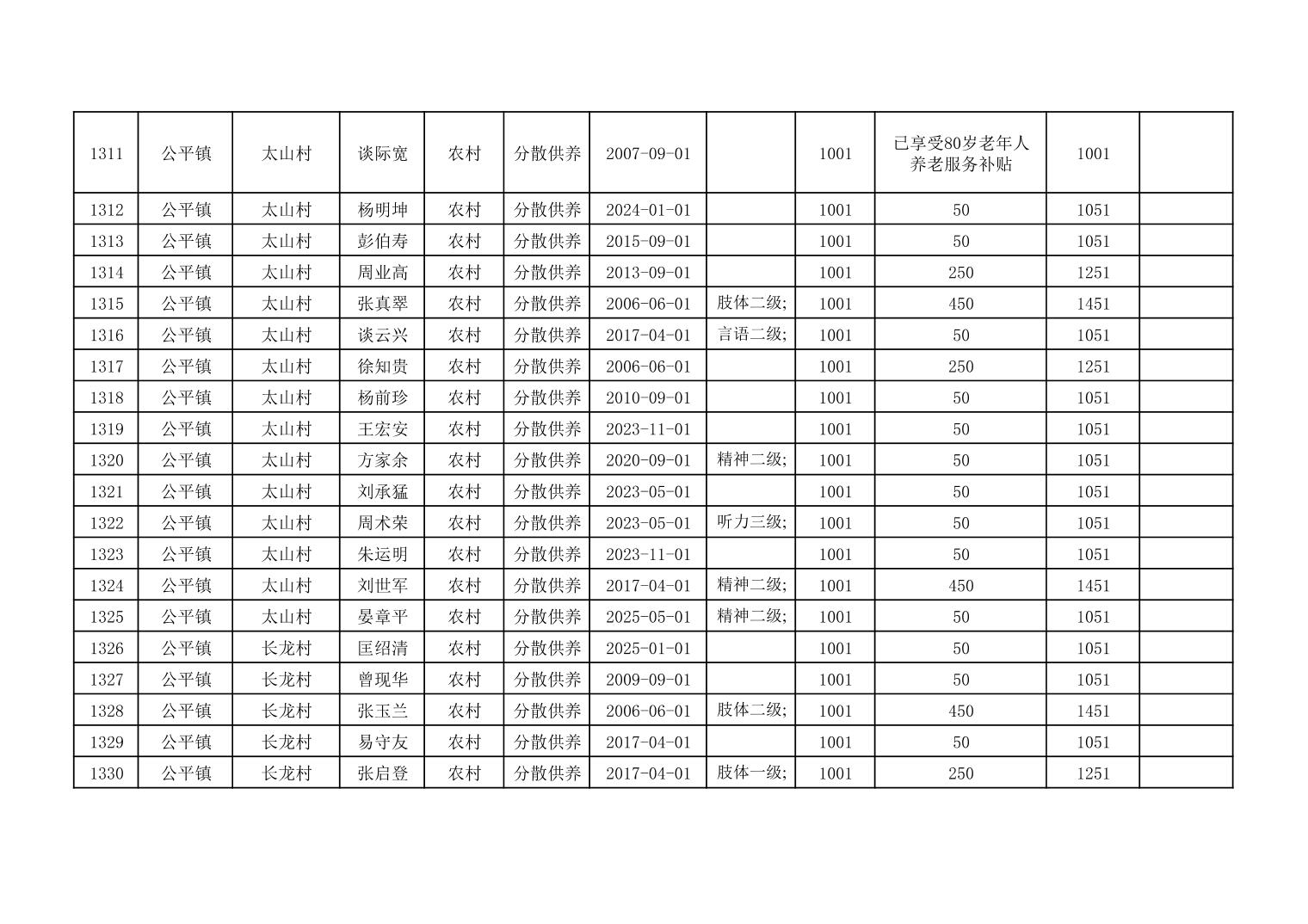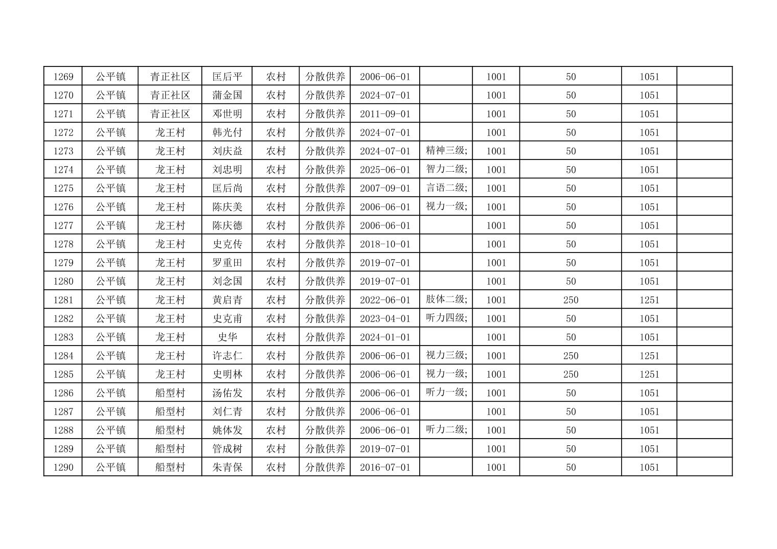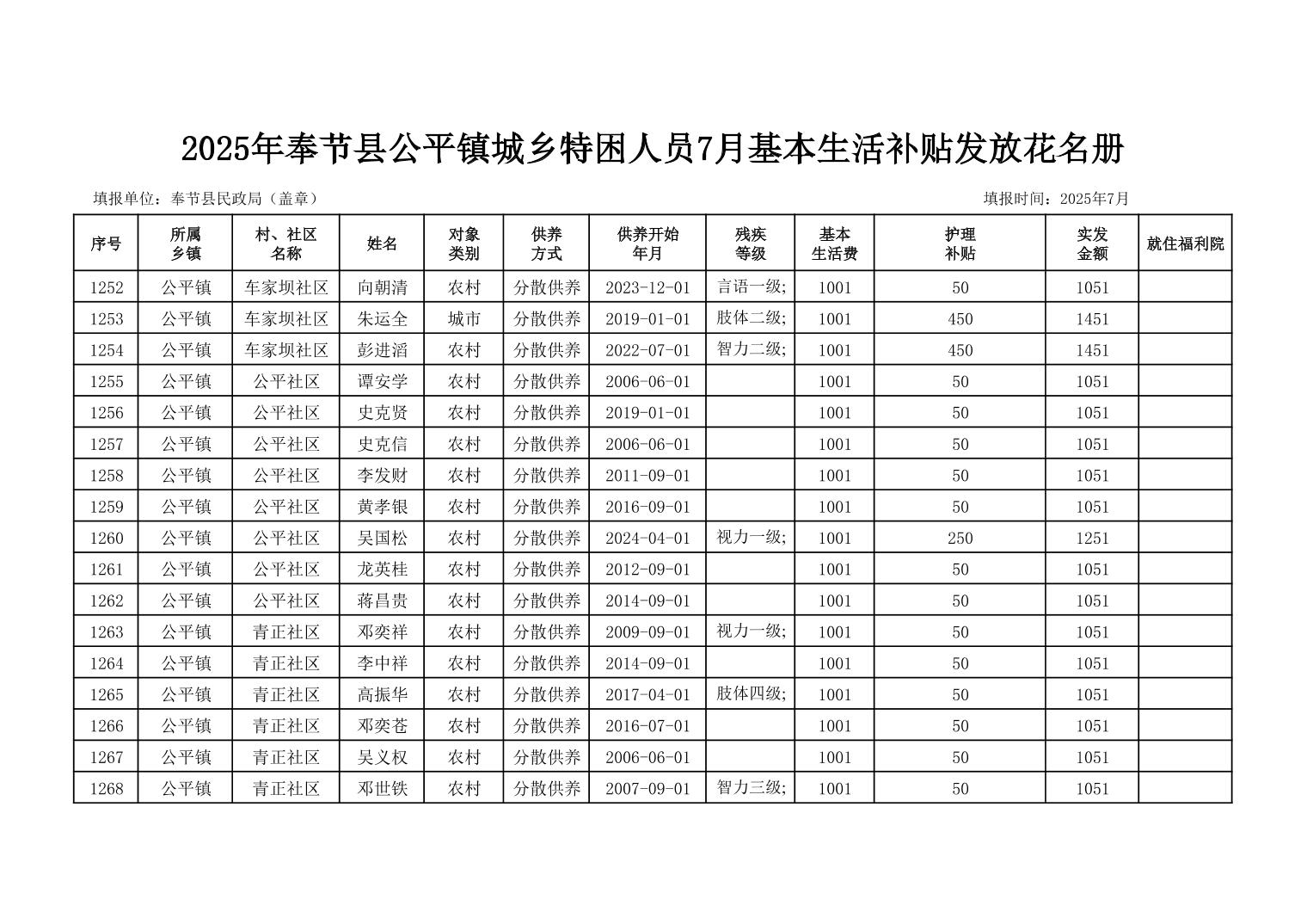 2025年奉节县公平镇城乡特困人员7月基本生活补贴发放花名册