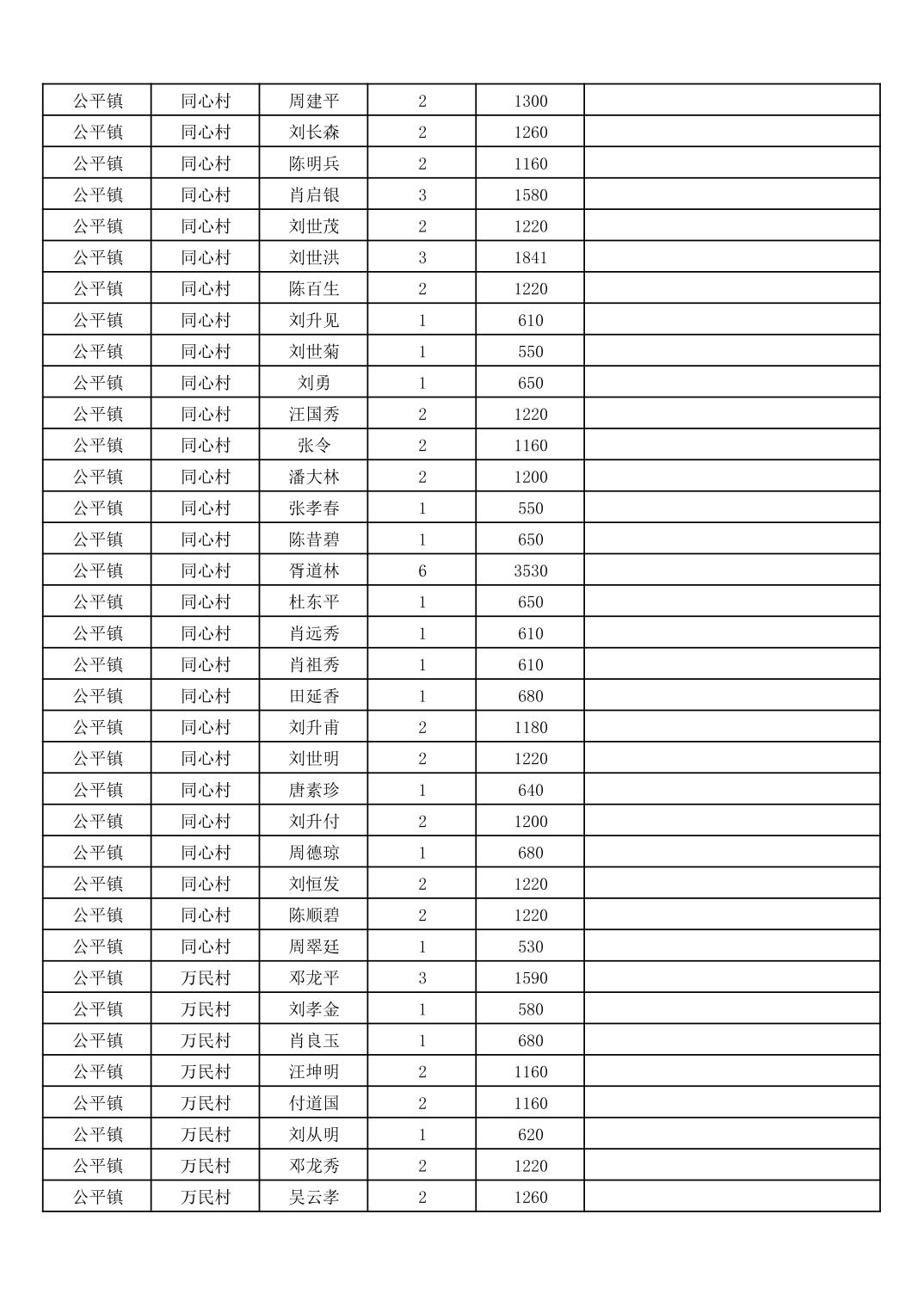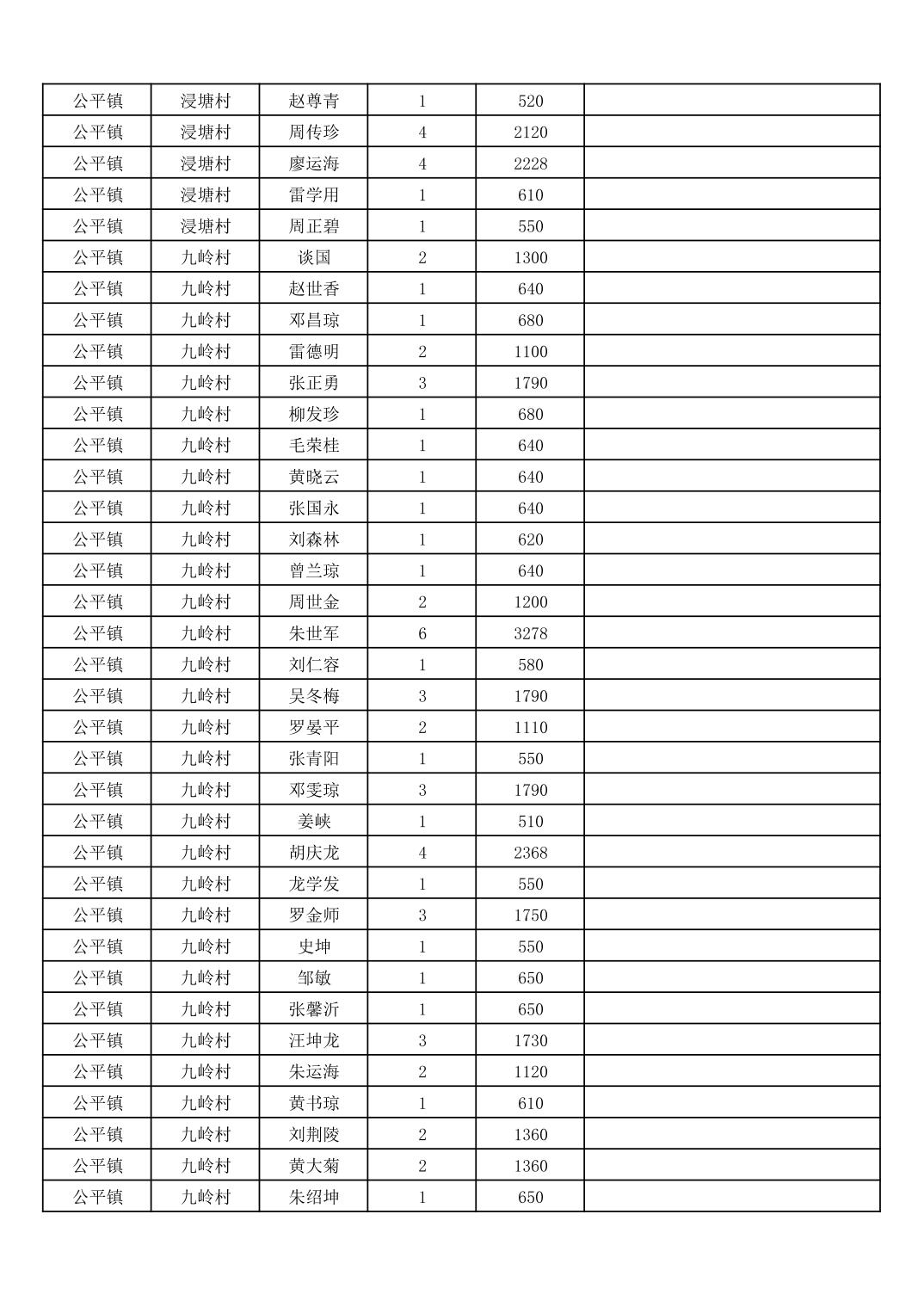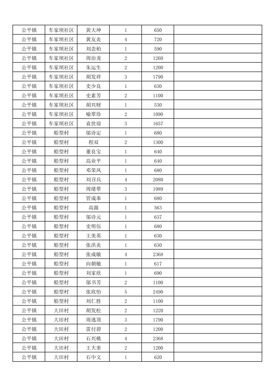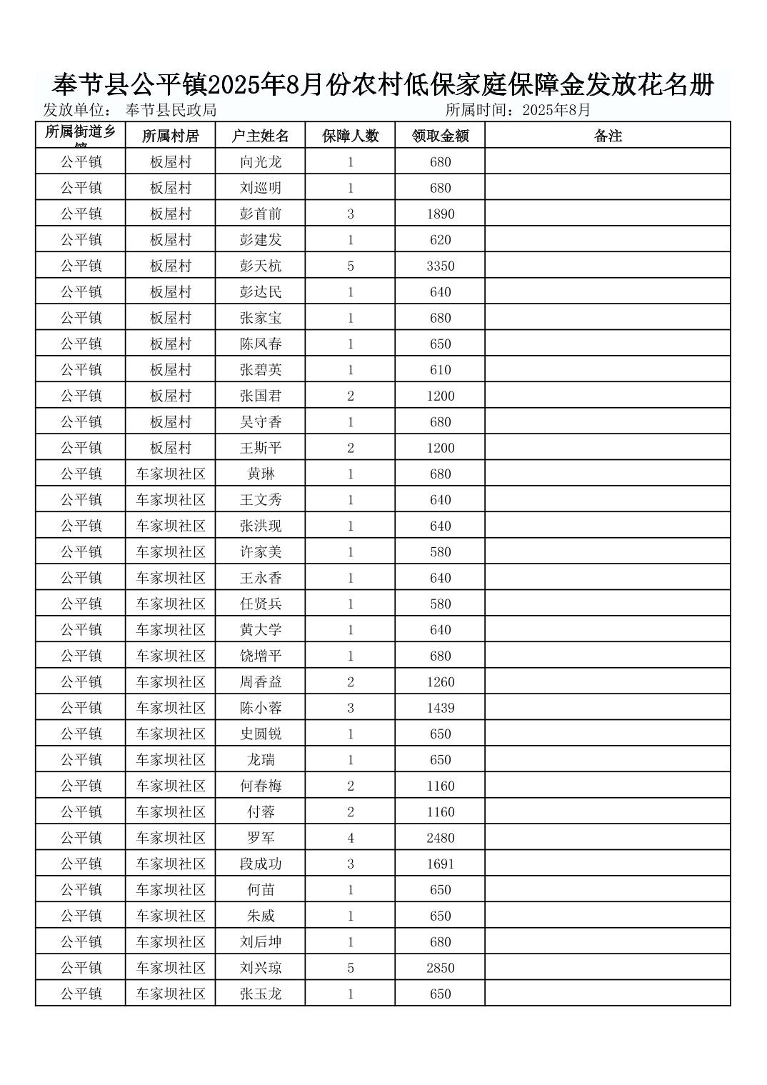 奉节县公平镇2025年8月份农村低保家庭保障金发放花名册