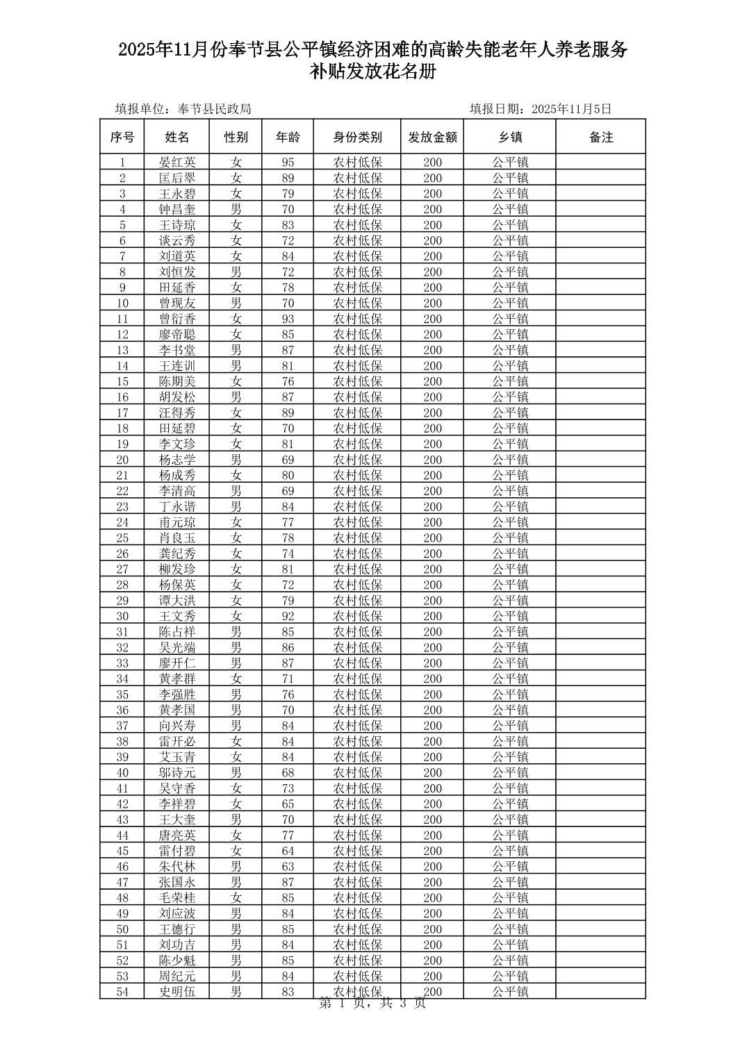 2025年11月份奉节县公平镇经济困难的高龄失能老年人养老服务补贴发放花名册