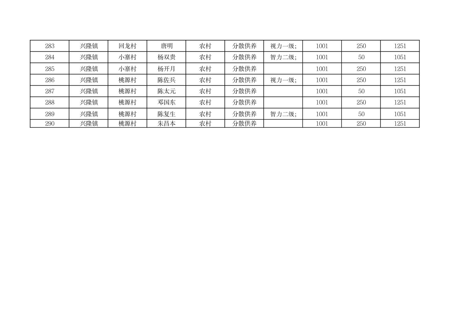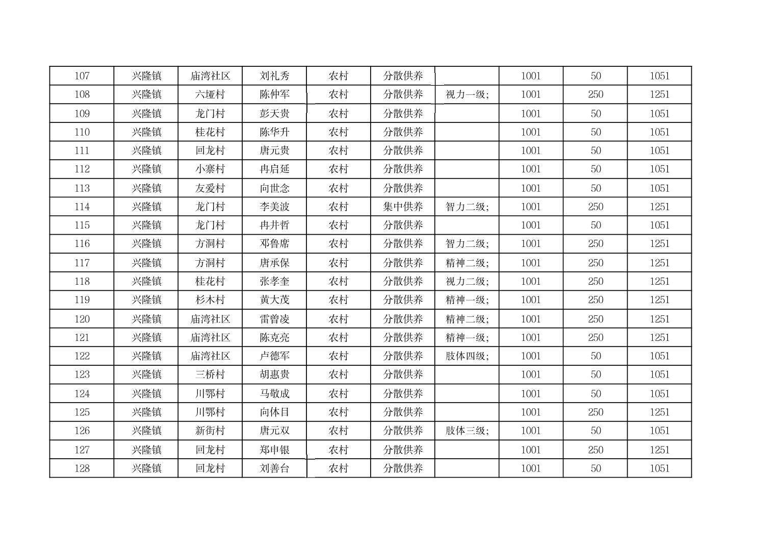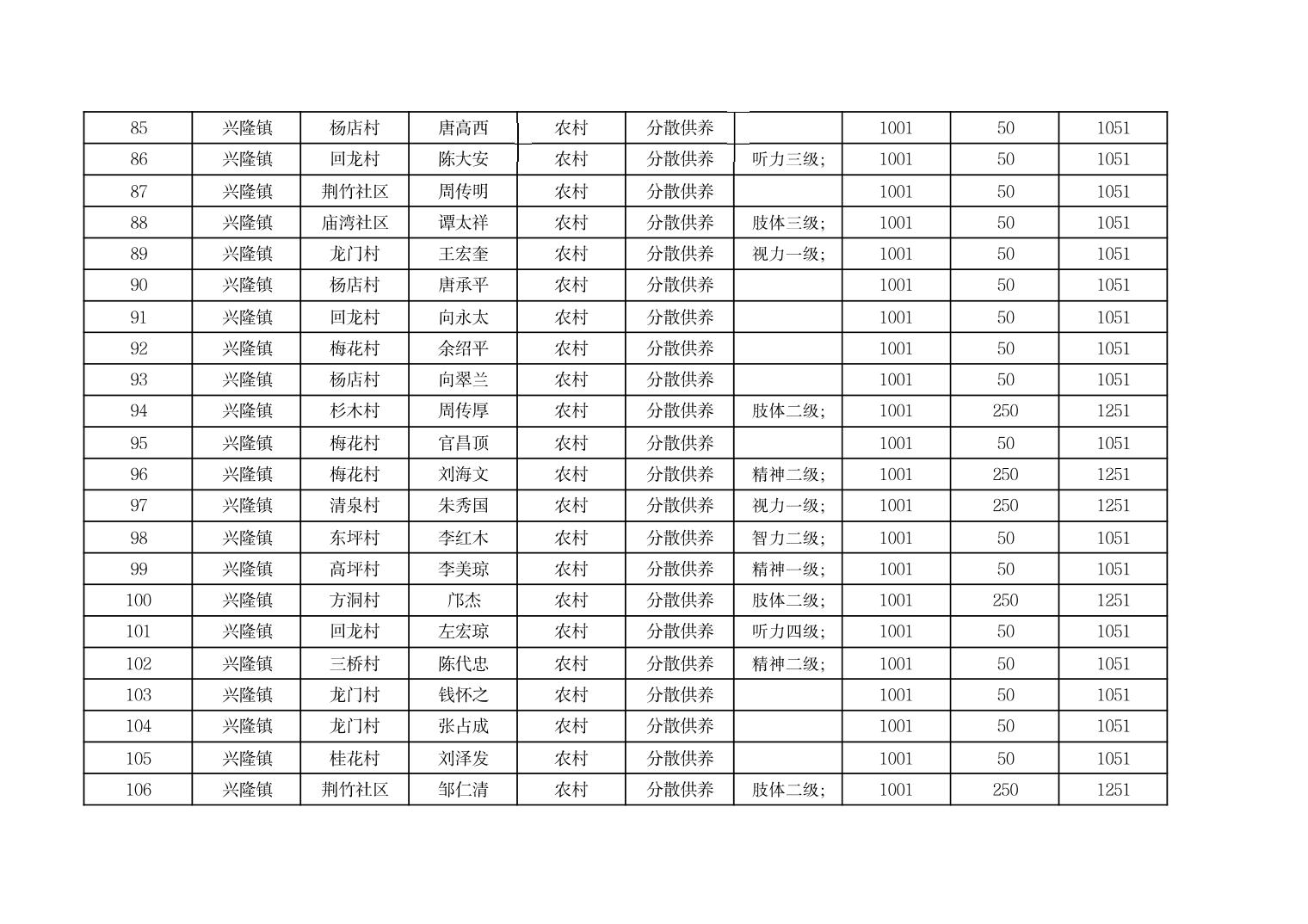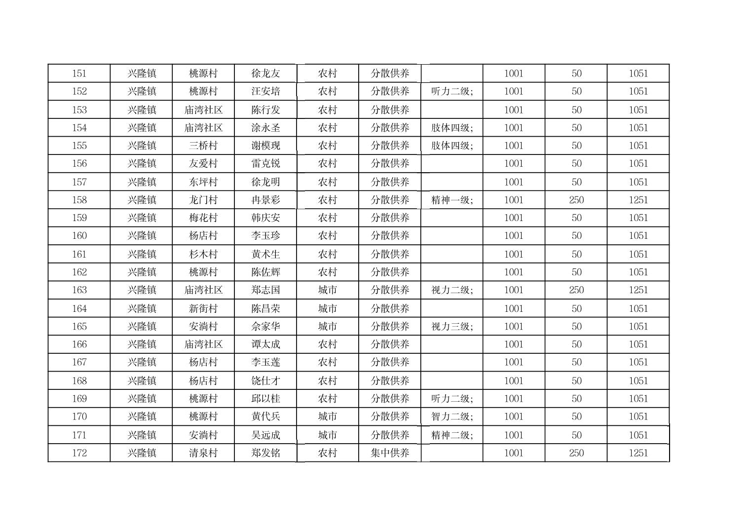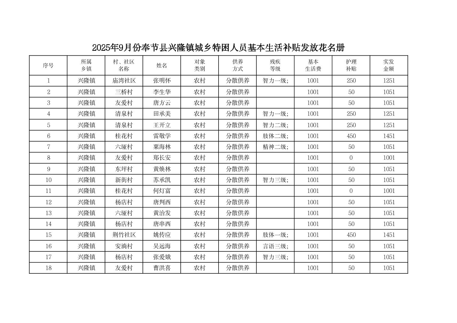 2025年9月份奉节县兴隆镇城乡特困人员基本生活补贴发放花名册