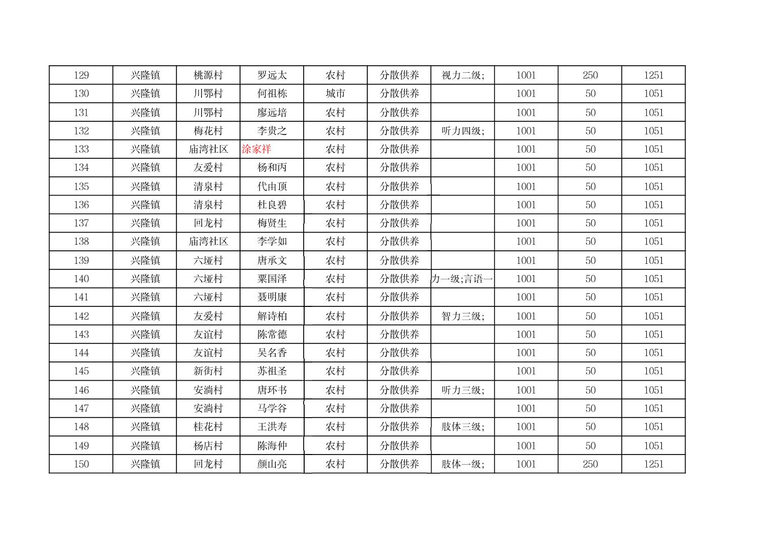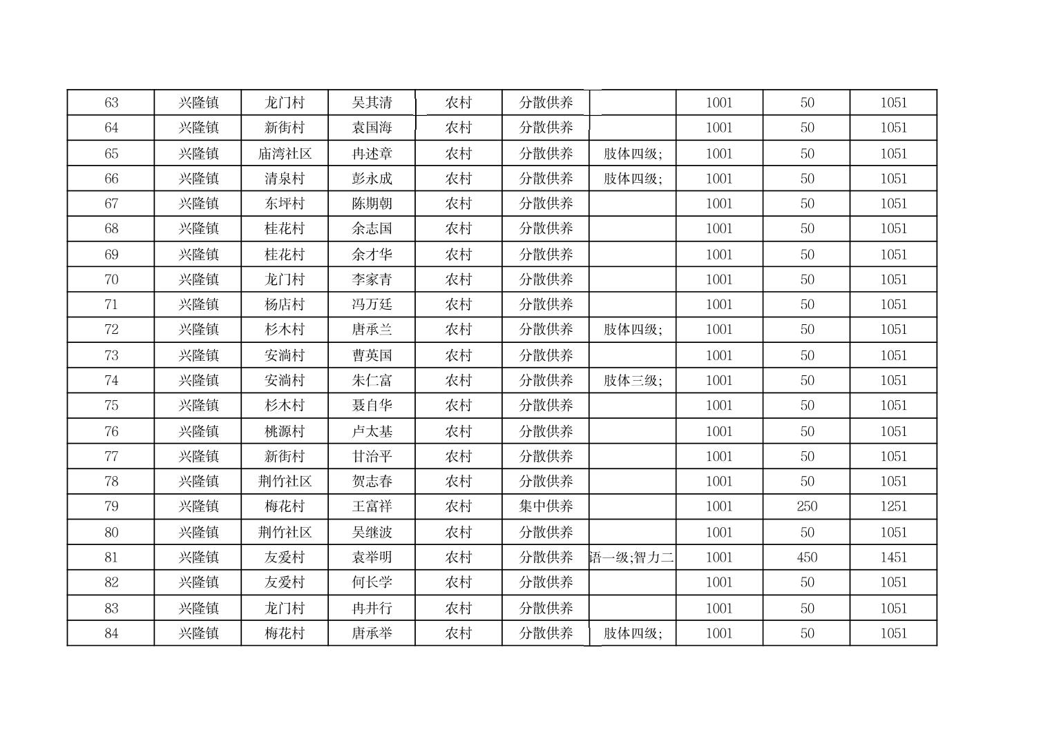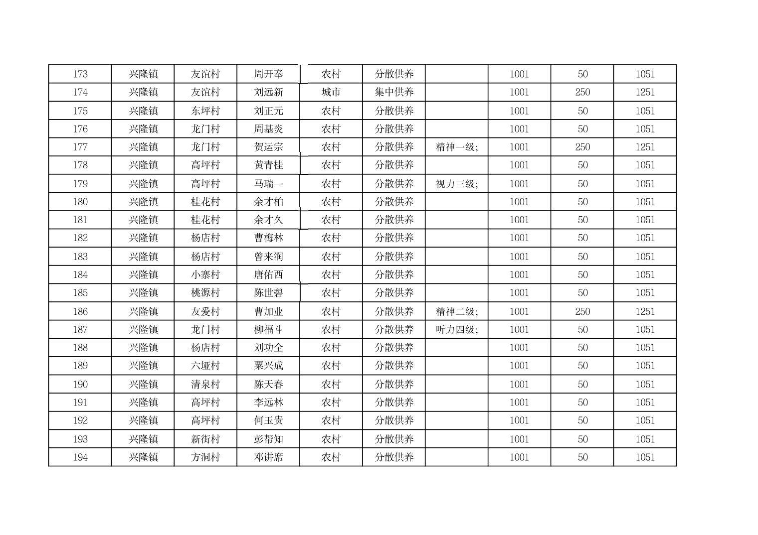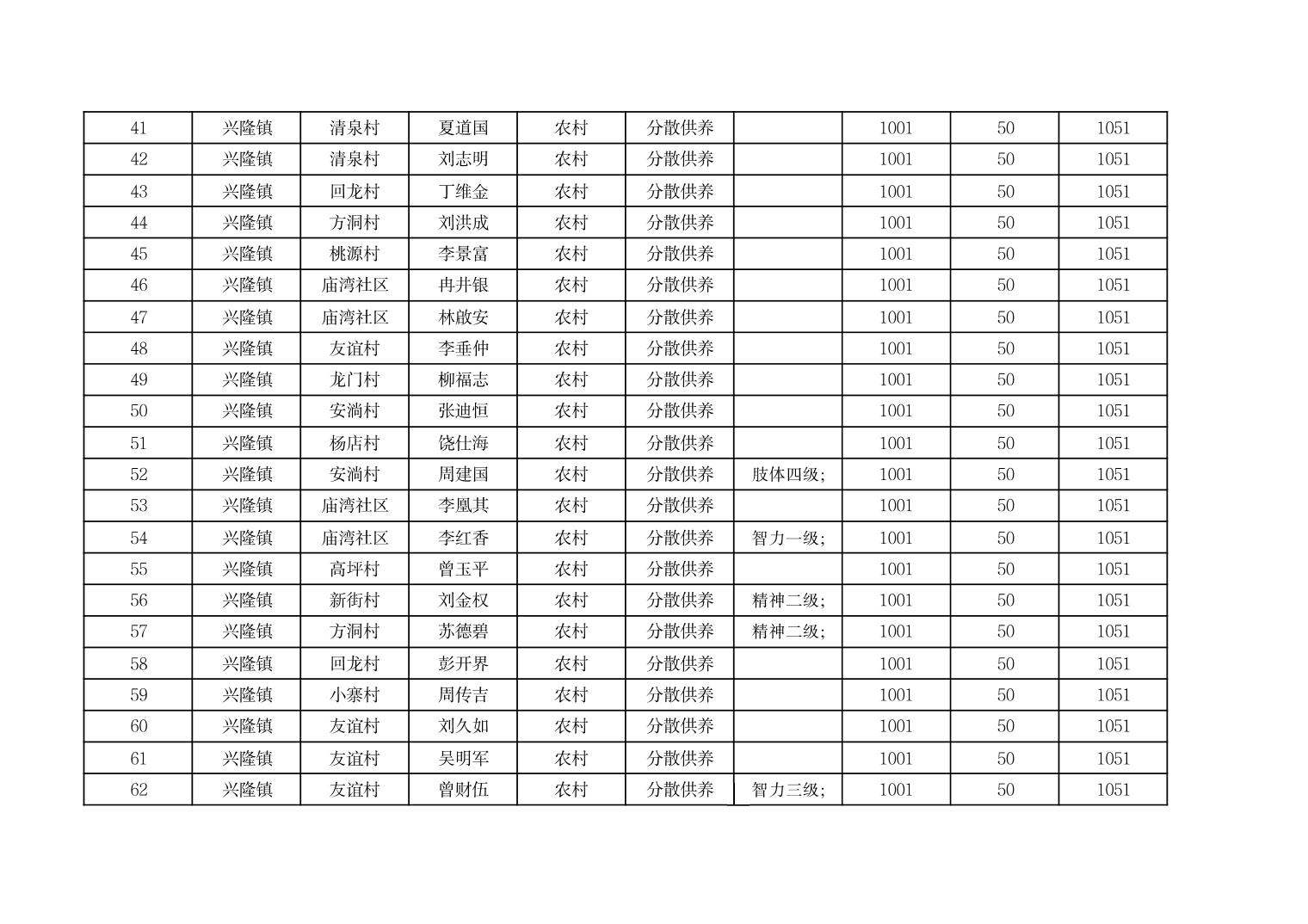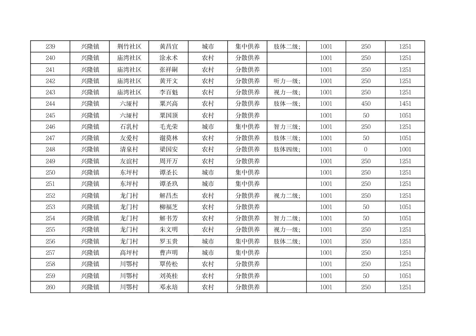 2025年9月份奉节县兴隆镇城乡特困人员基本生活补贴发放花名册