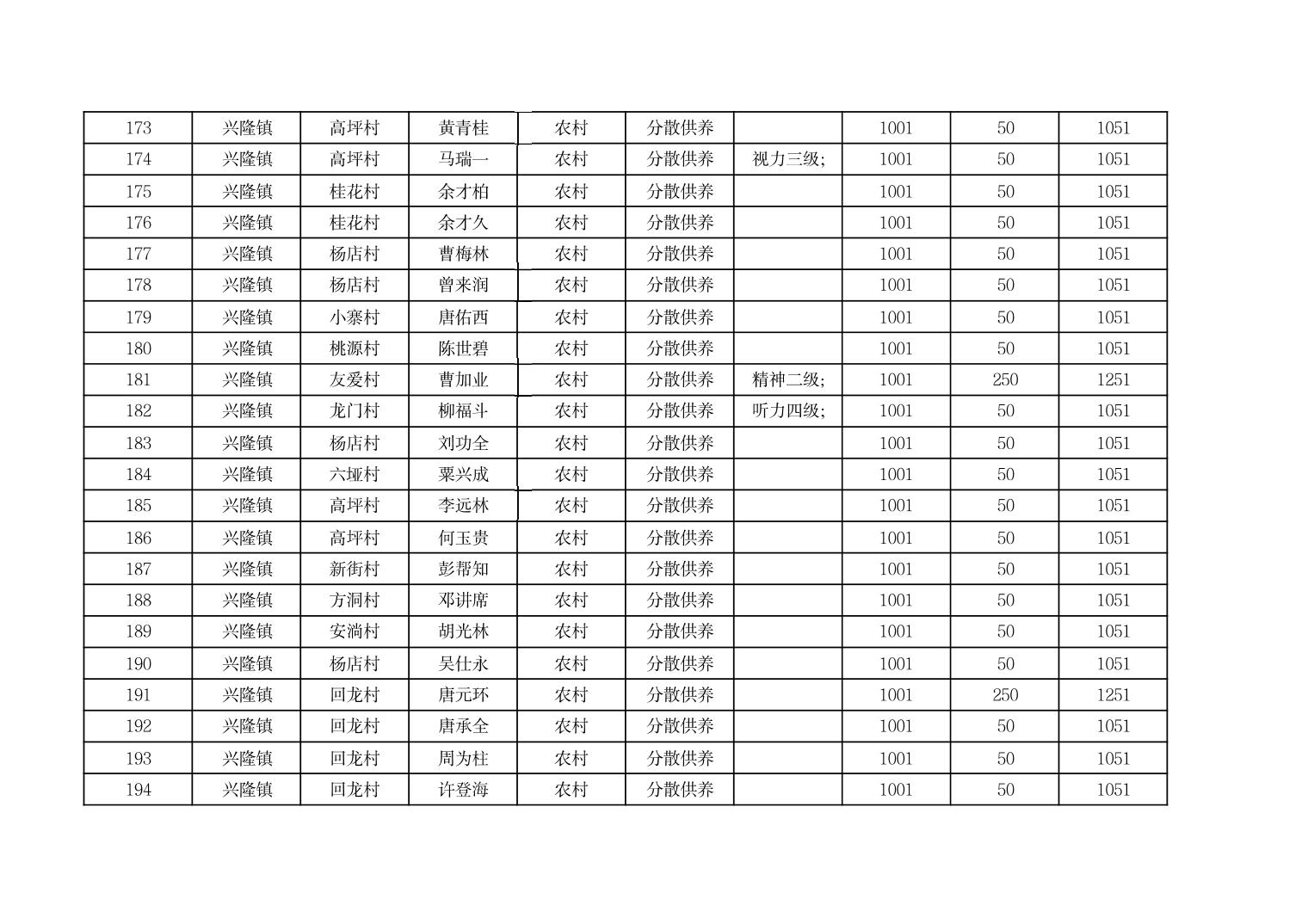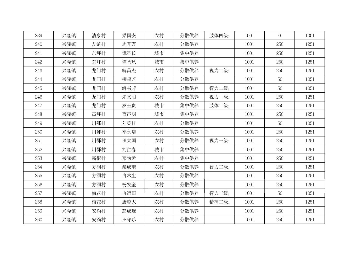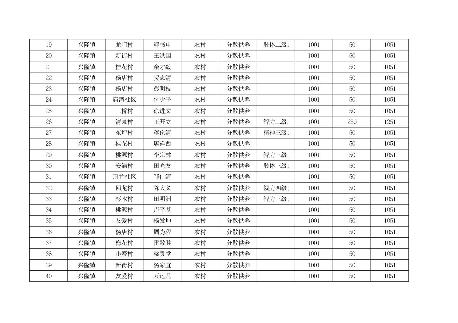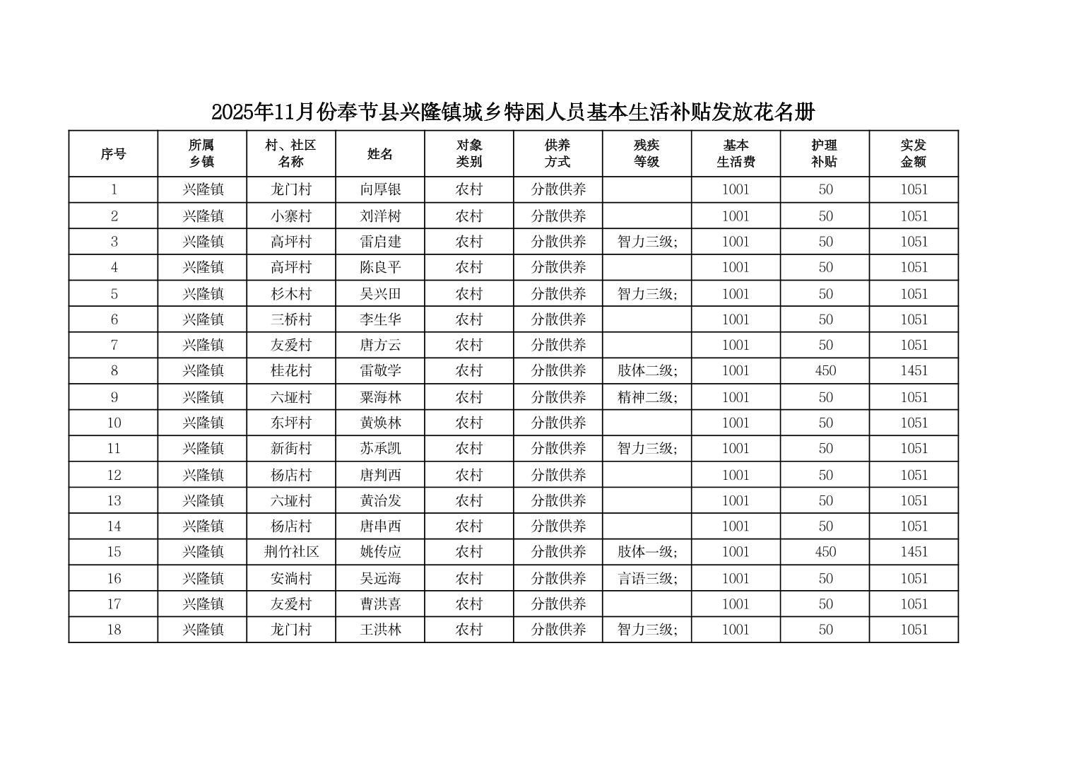 2025年11月份奉节县兴隆镇城乡特困人员基本生活补贴发放花名册