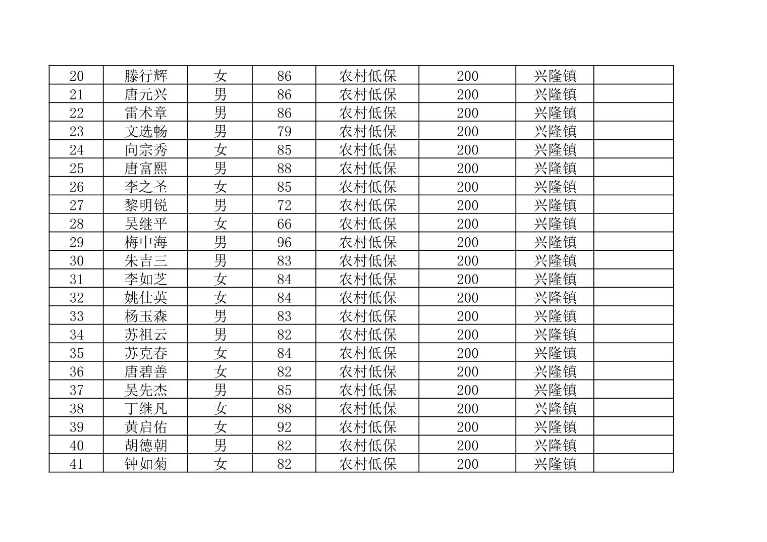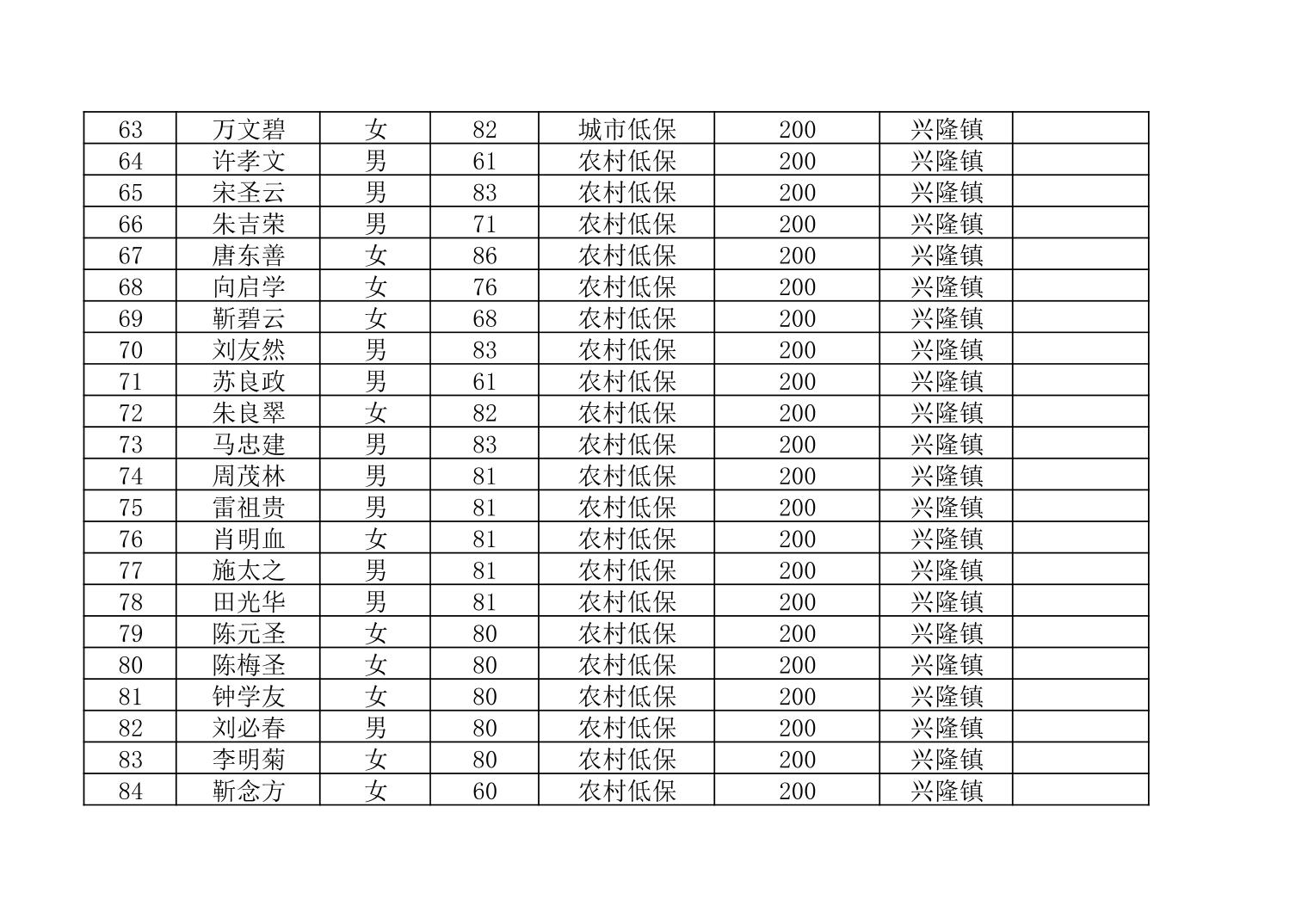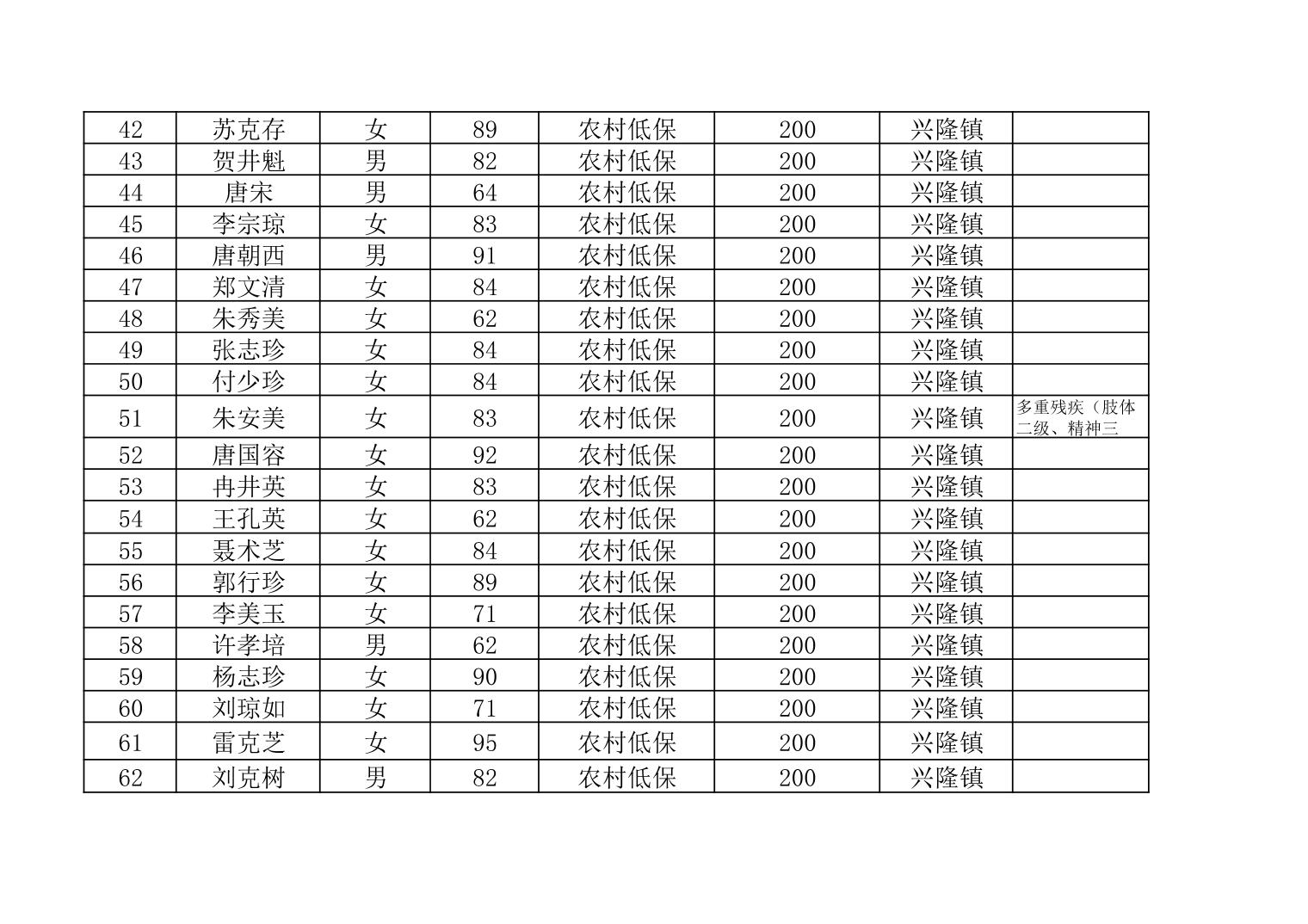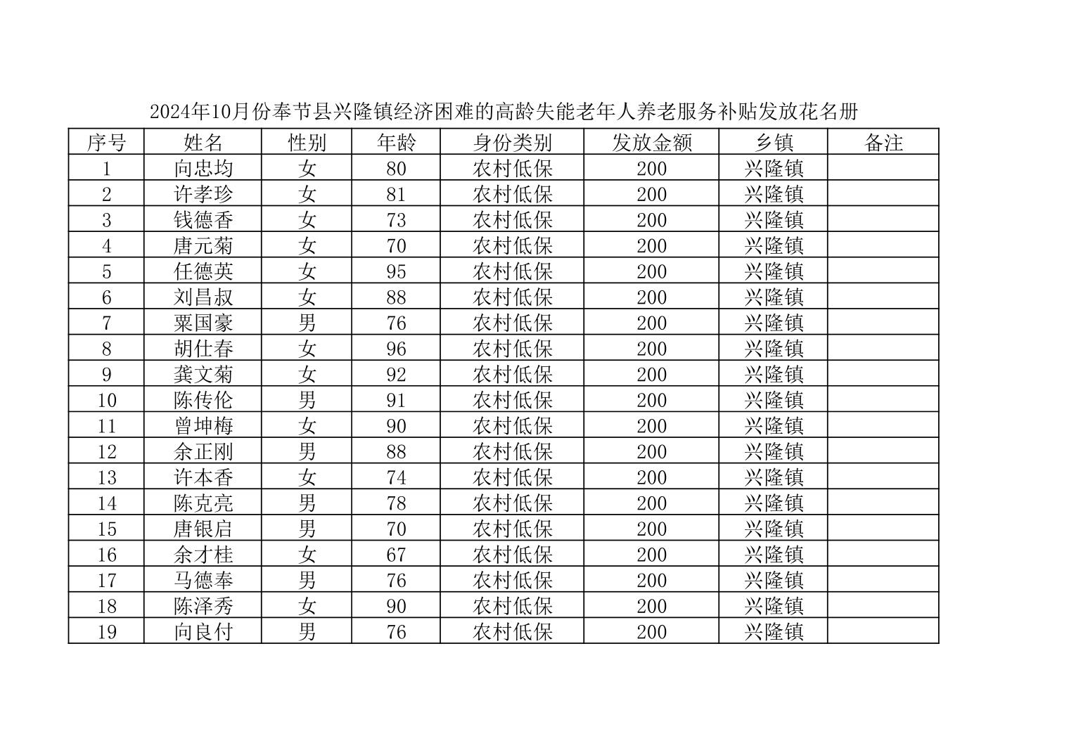 2024年10月份奉节县兴隆镇经济困难的高龄失能老年人养老服务补贴发放花名册