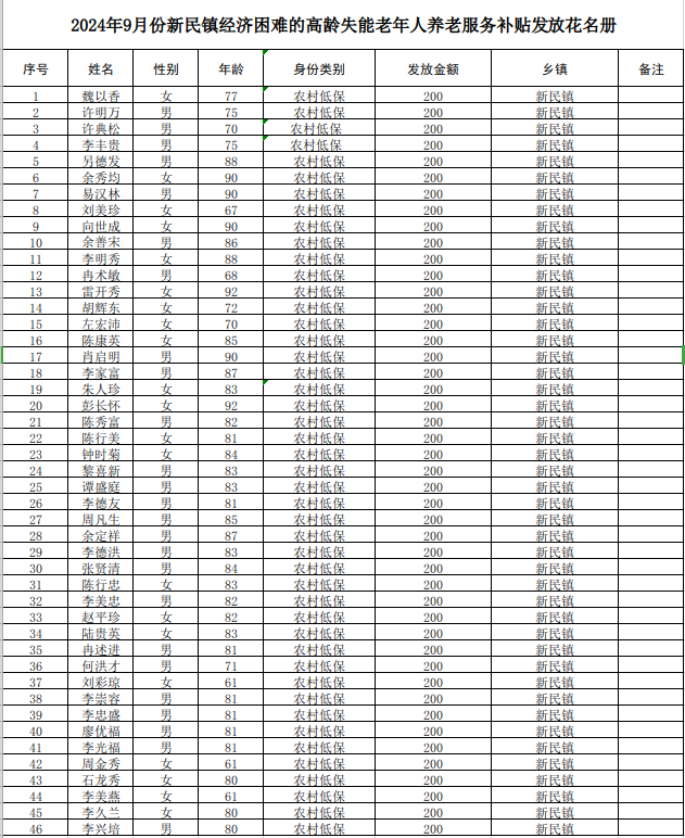 2024年9月份新民镇经济困难的高龄失能老年人养老服务补贴发放花名册