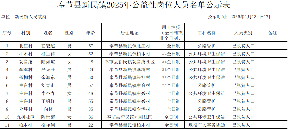奉节县新民镇2025年公益性岗位人员名单公示表