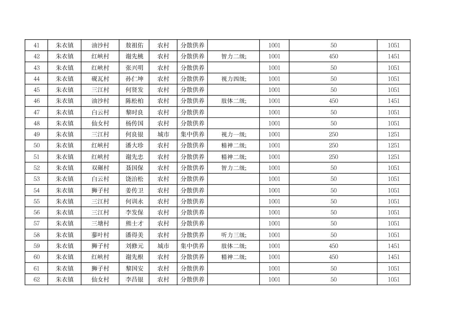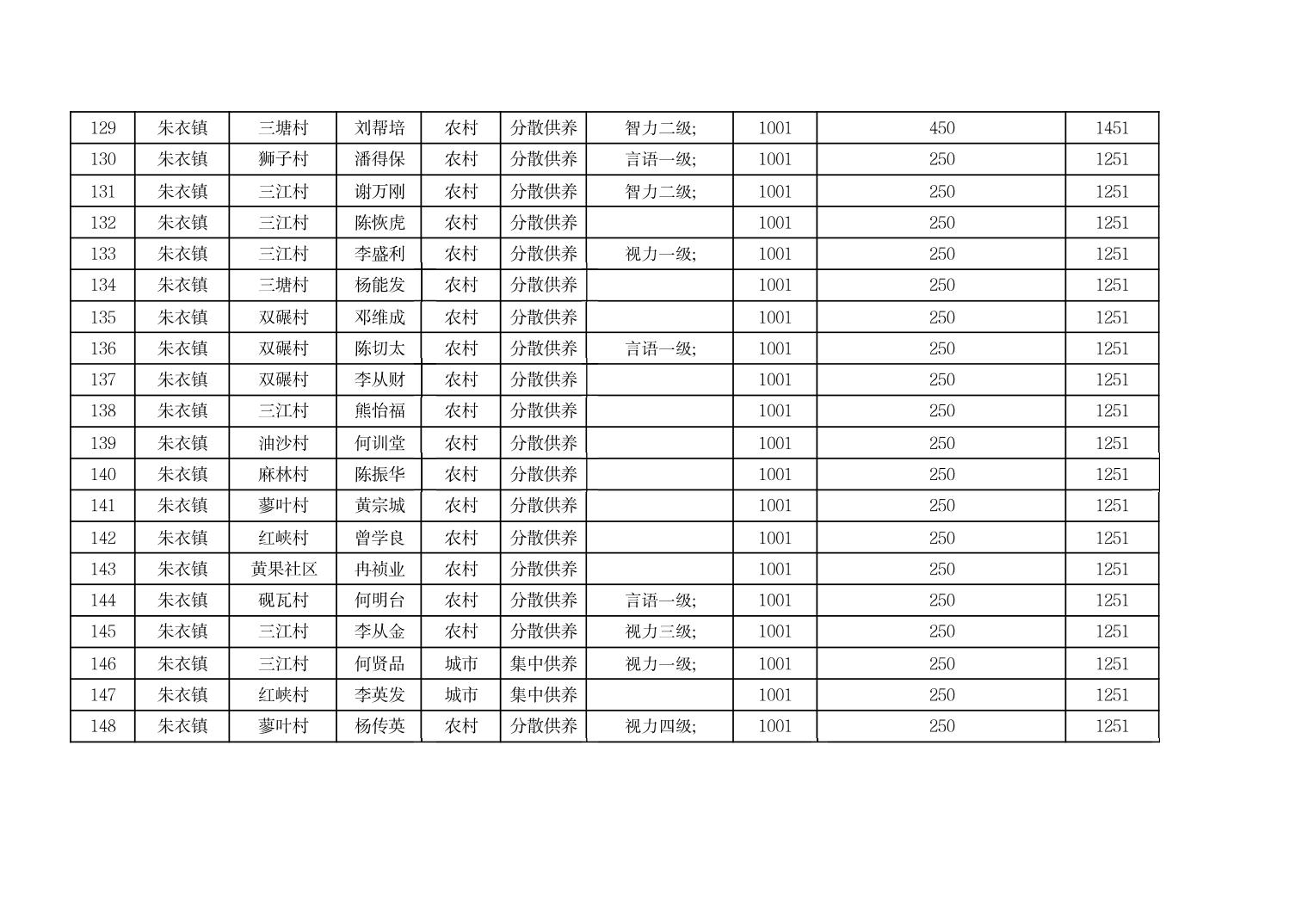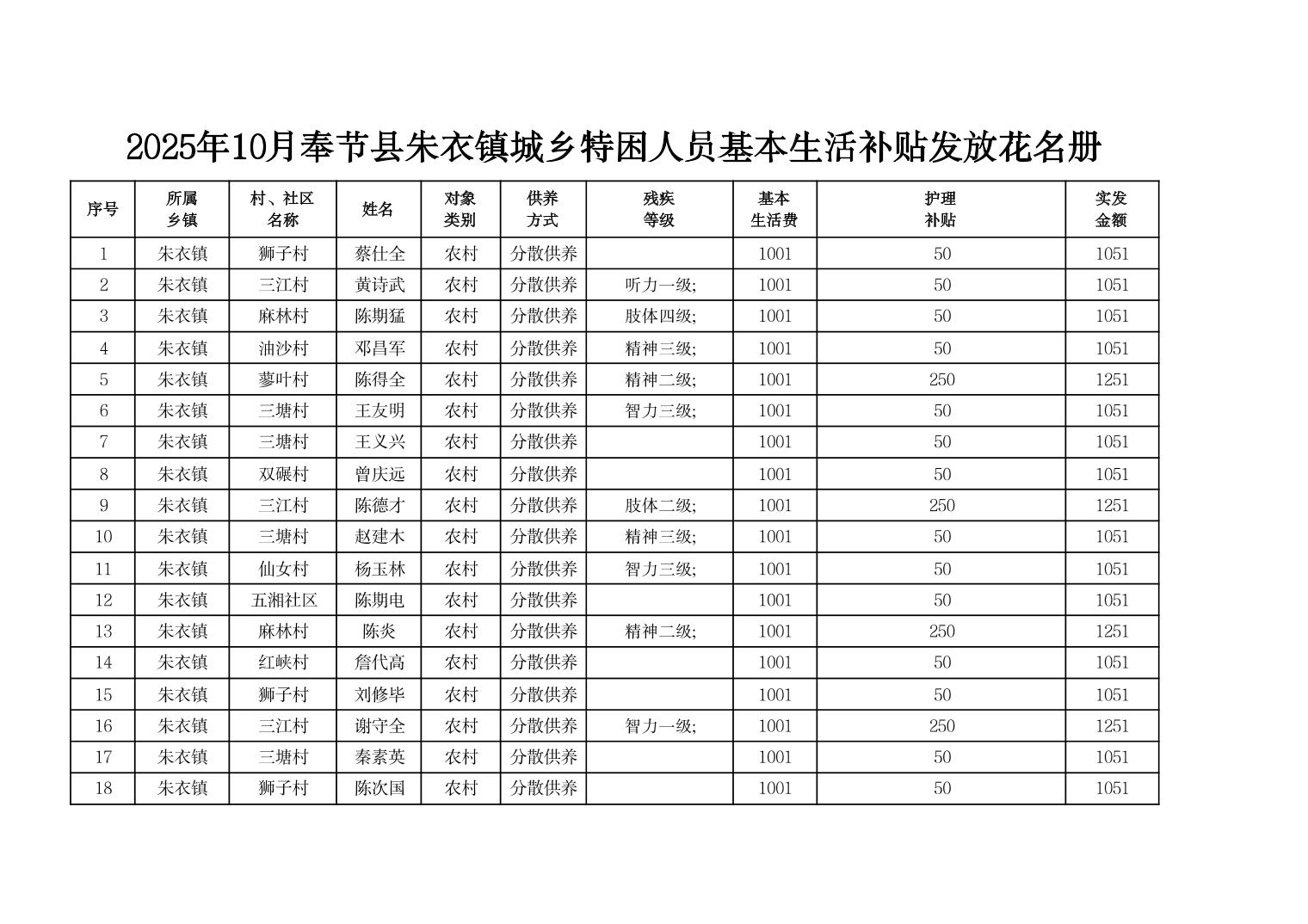 2025年10月奉节县朱衣镇城乡特困人员基本生活补贴发放花名册