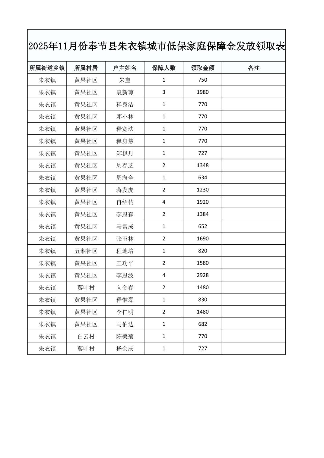 2025年11月份奉节县朱衣镇城市低保家庭保障金发放领取表