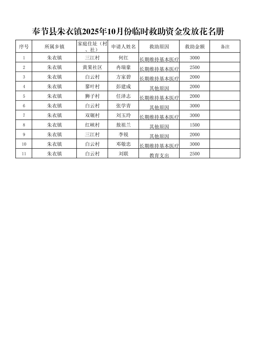 奉节县朱衣镇2025年10月份临时救助资金发放花名册