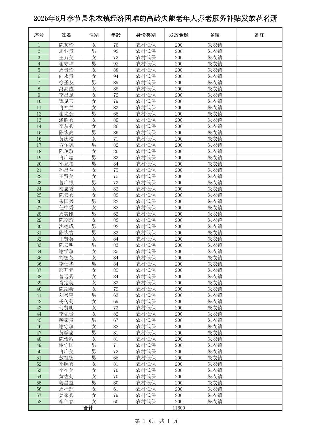 2025年6月奉节县朱衣镇经济困难的高龄失能老年人养老服务补贴发放花名册