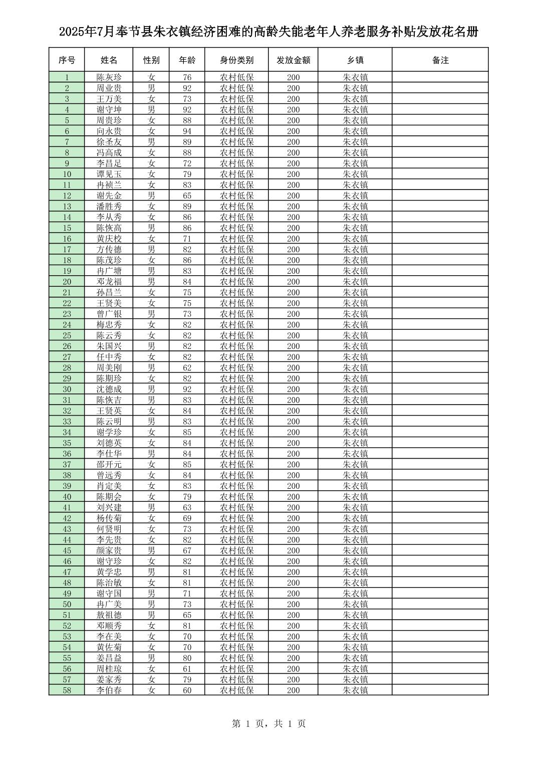 2025年7月奉节县朱衣镇经济困难的高龄失能老年人养老服务补贴发放花名册