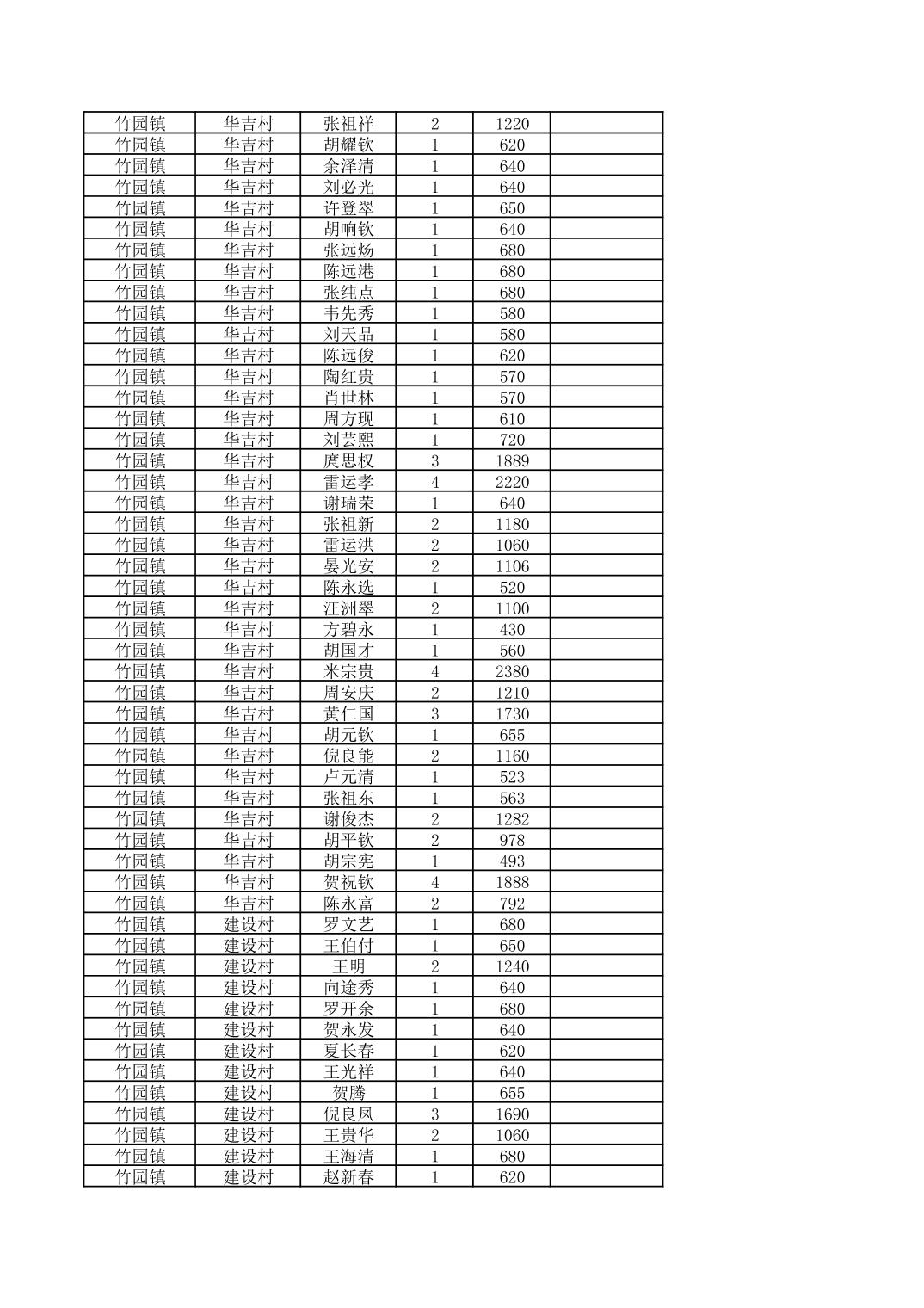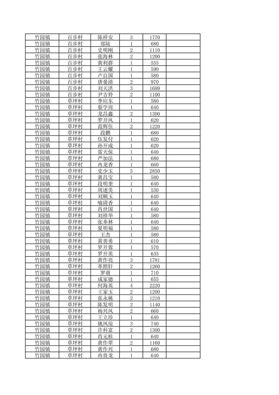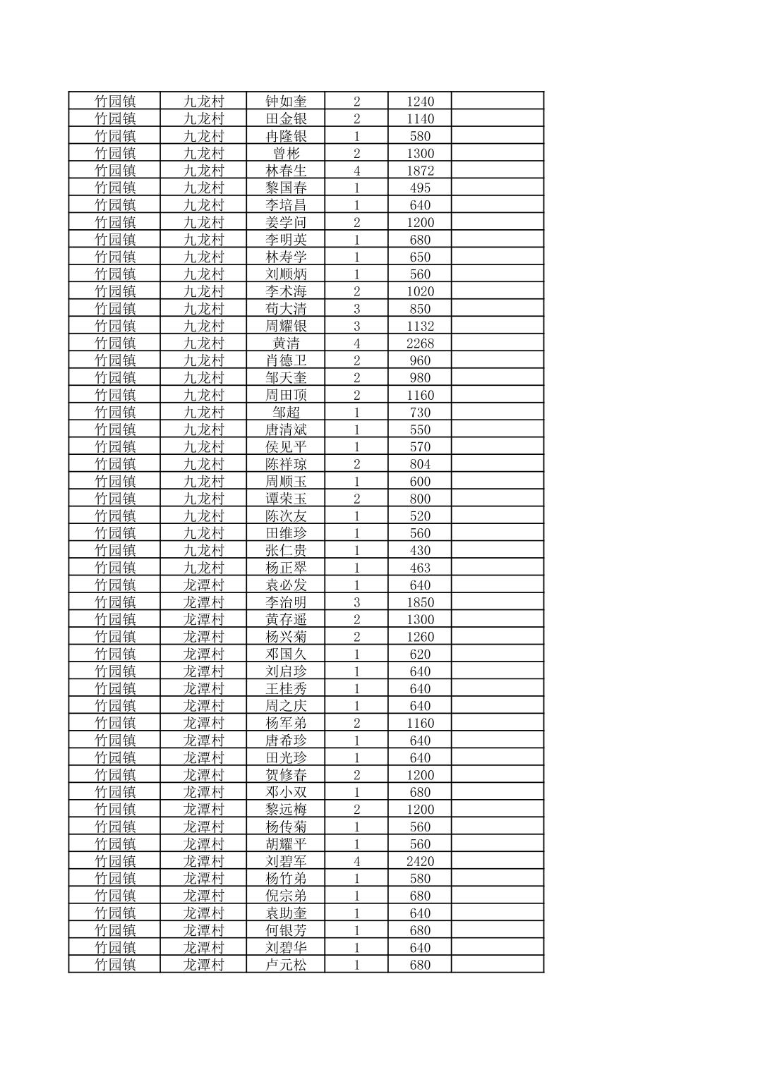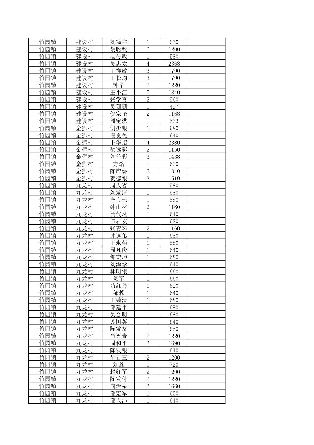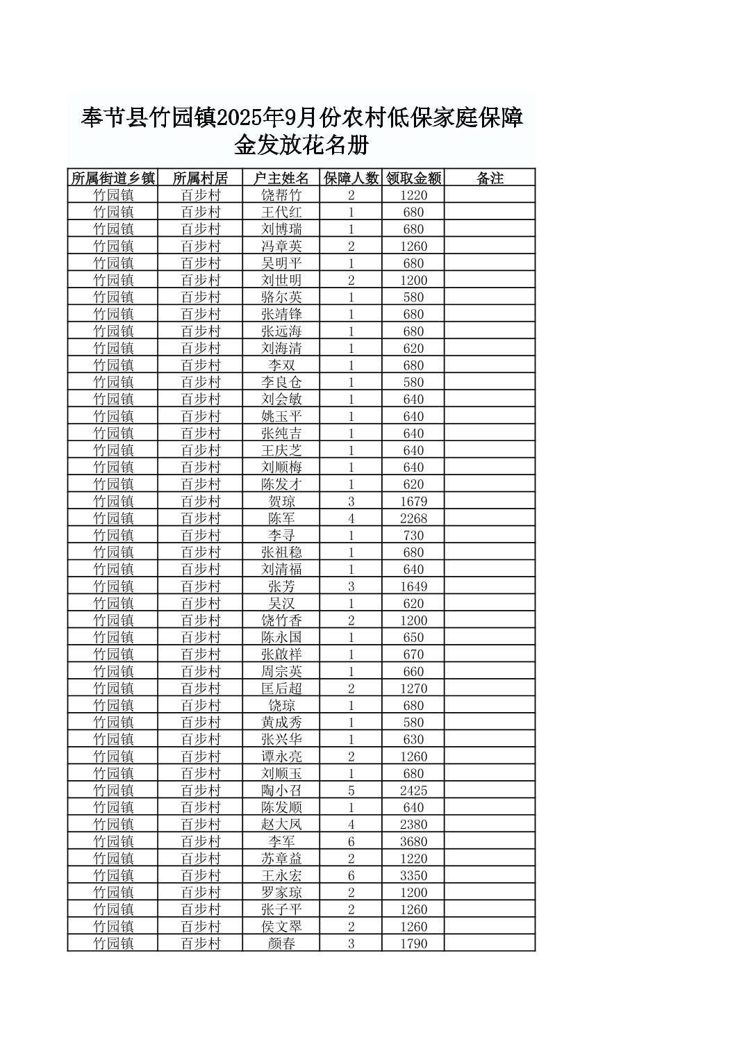 奉节县竹园镇2025年9月份农村低保家庭保障金发放花名册