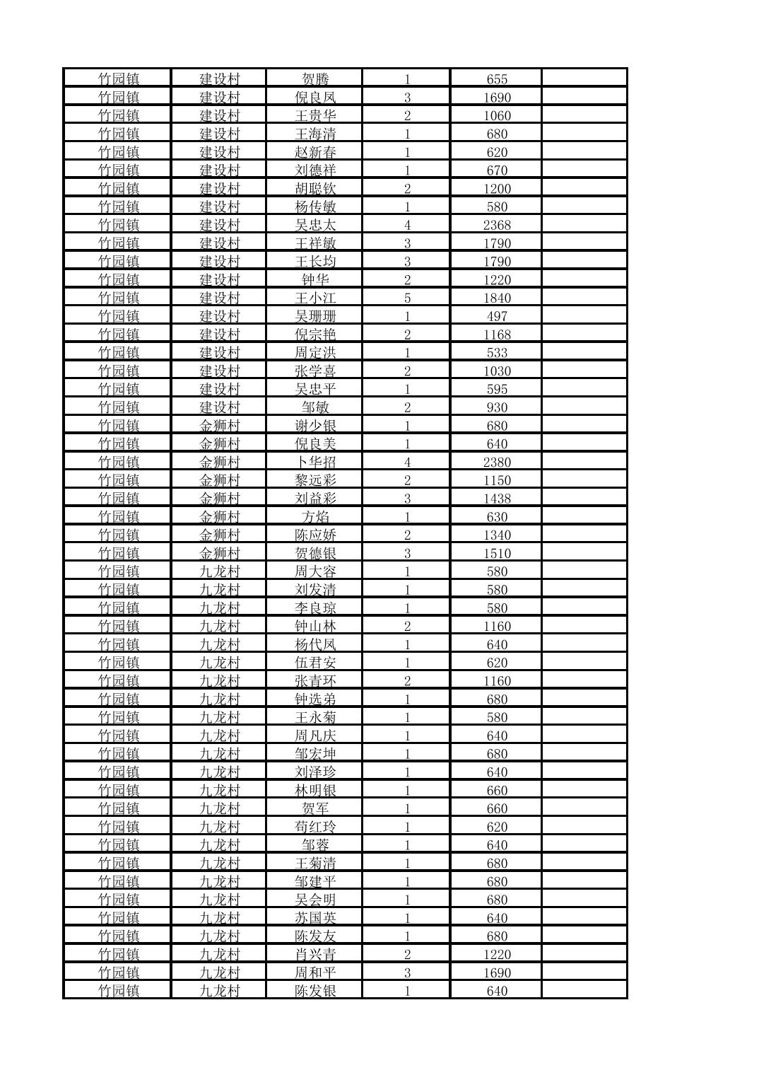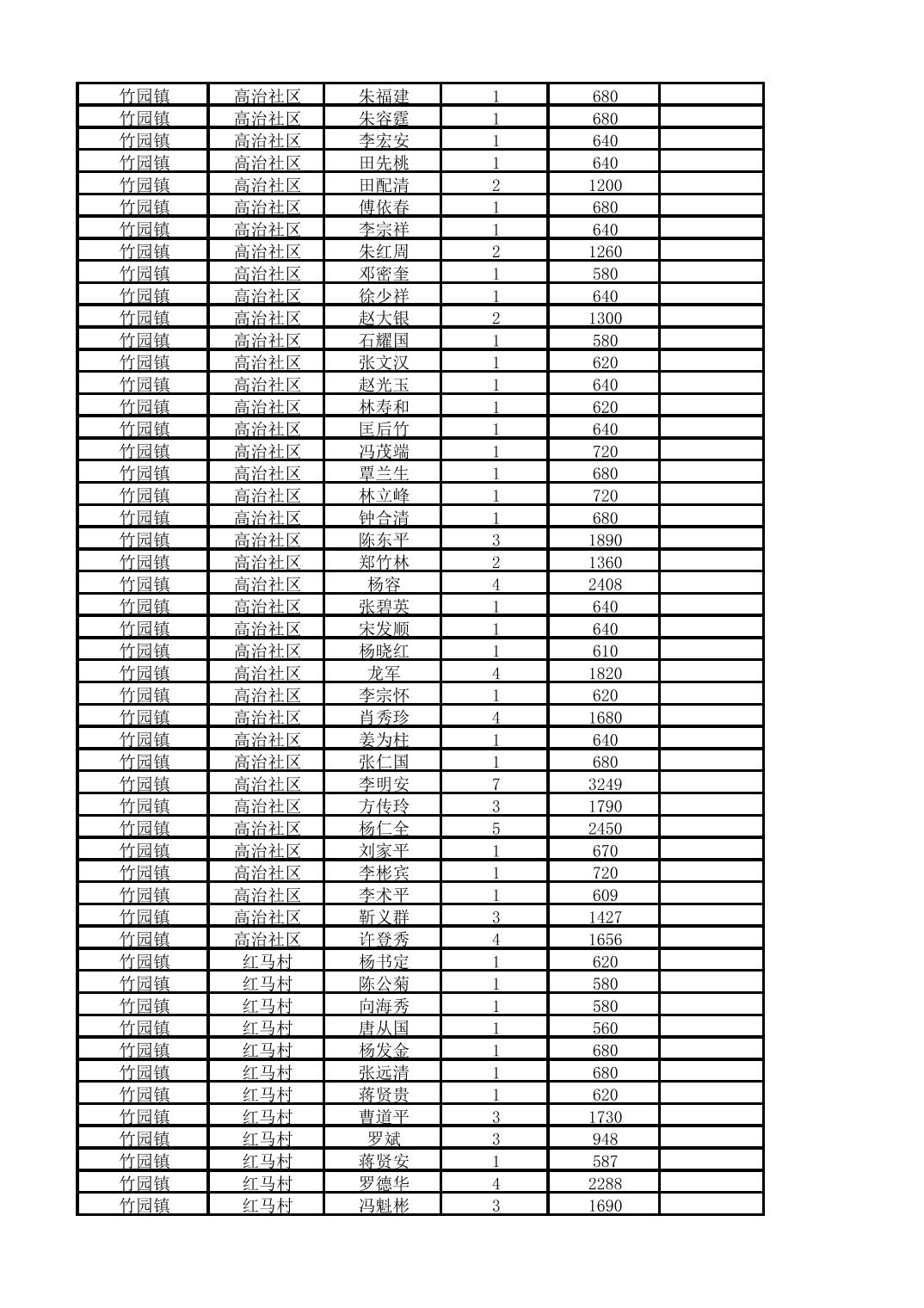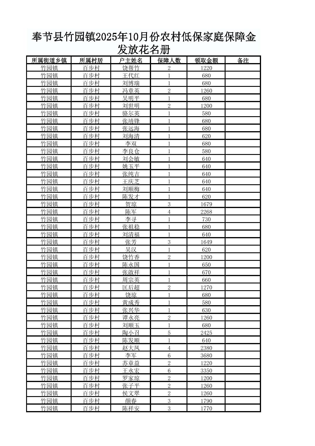 奉节县竹园镇2025年10月份农村低保家庭保障金发放花名册