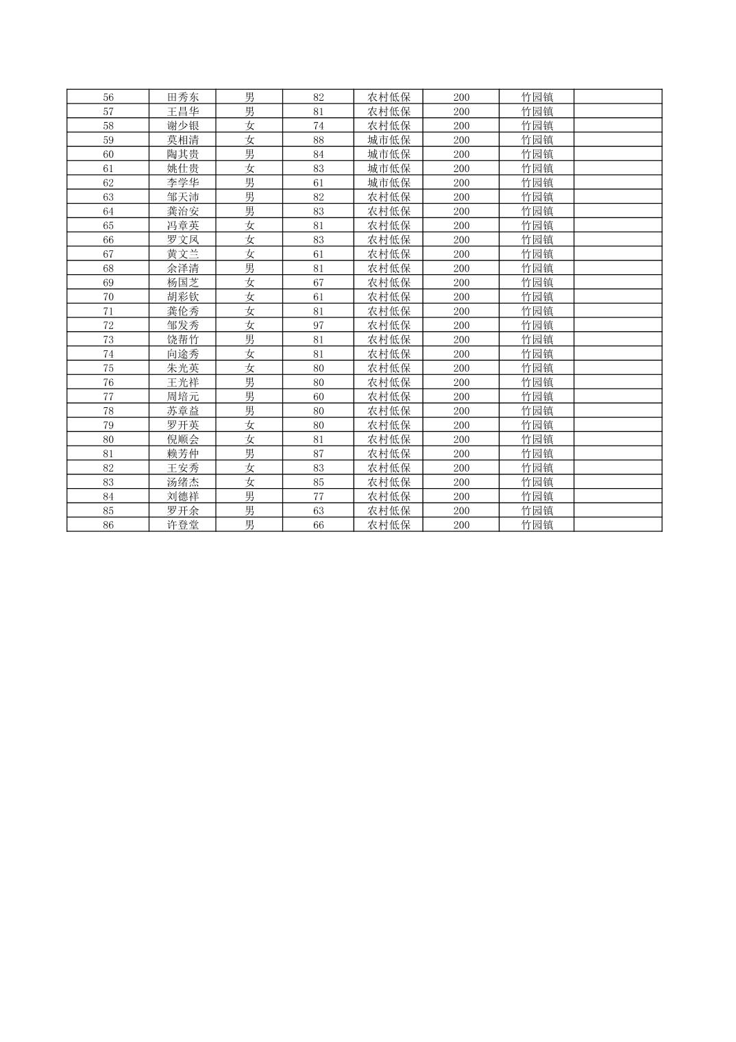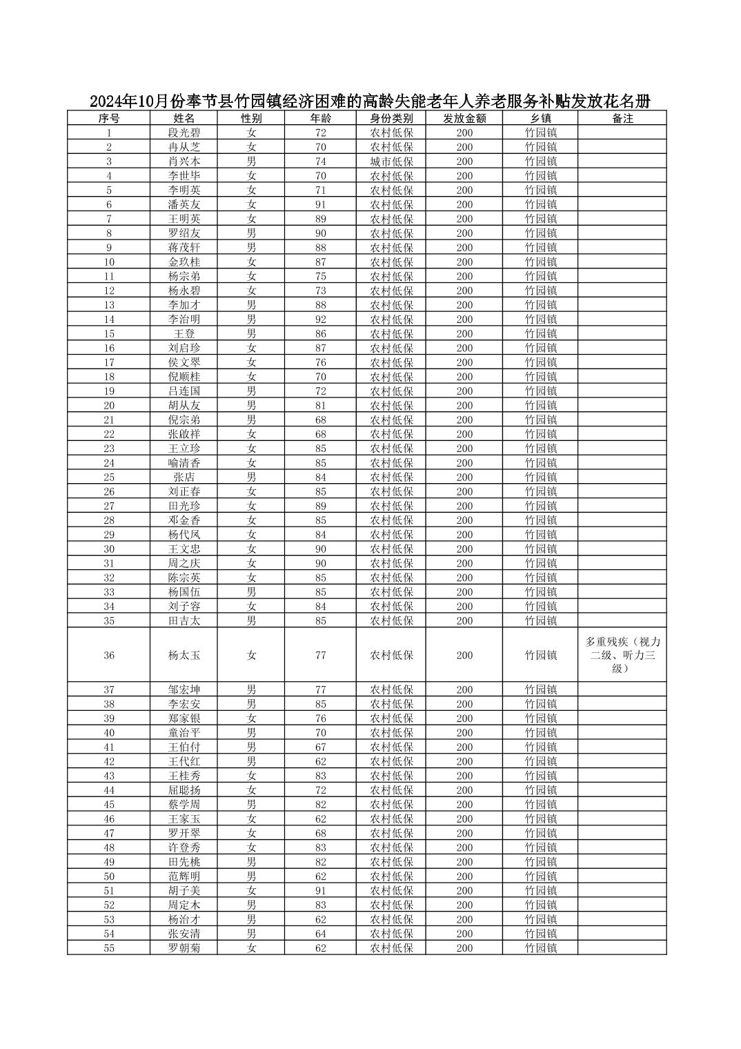 2024年10月份奉节县竹园镇经济困难的高龄失能老年人养老服务补贴发放花名册