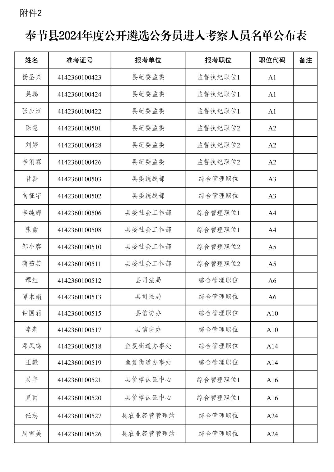 2.奉节县2024年度公开遴选公务员进入考察人员名单公布表