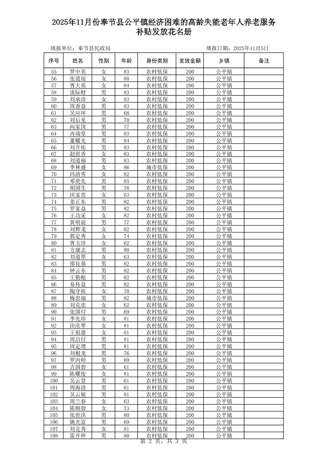 2025年11月份奉节县公平镇经济困难的高龄失能老年人养老服务补贴发放花名册