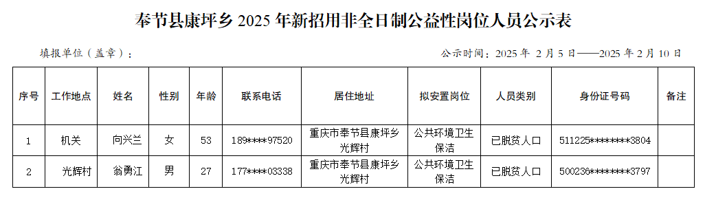 奉节县康坪乡2025年非全日制公益性岗位人员公示表