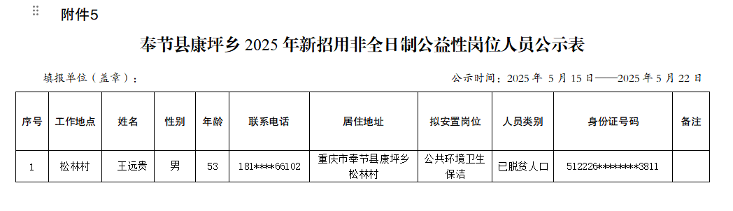奉节县康坪乡2025年新招用非全日制公益性岗位人员公示