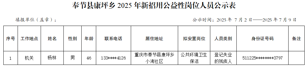 奉节县康坪乡2025年公益性岗位人员公示表
