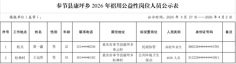 奉节县康坪乡2026年招用公益性岗位人员公示表