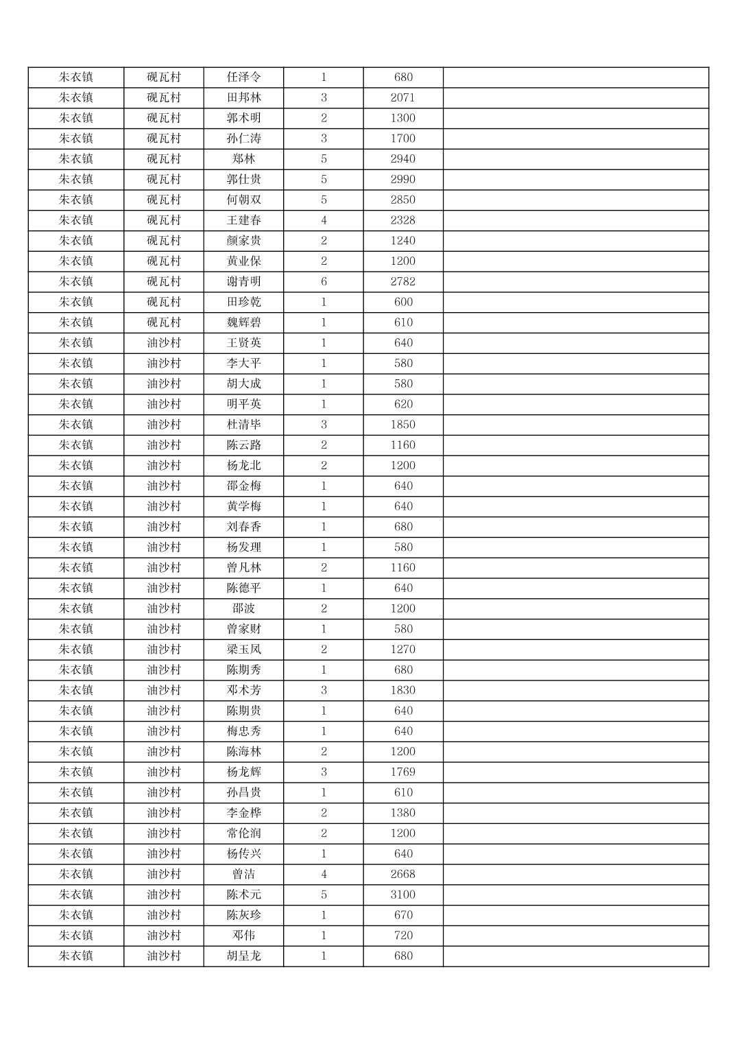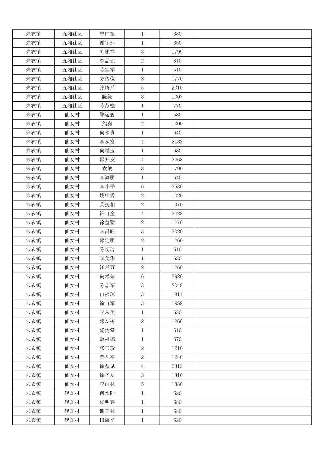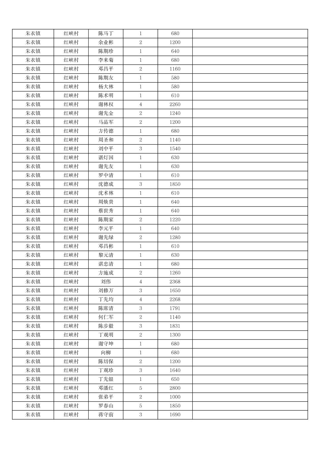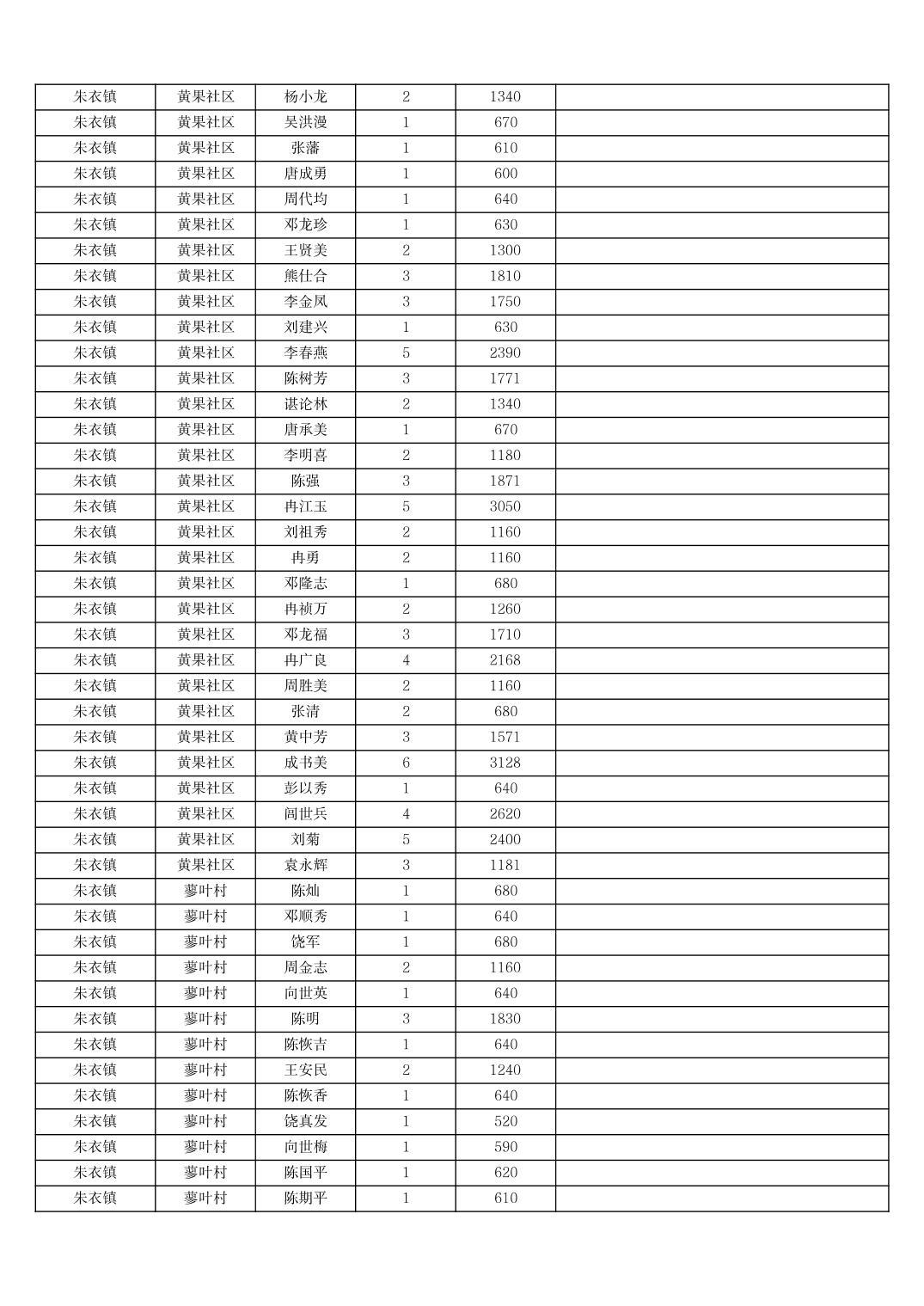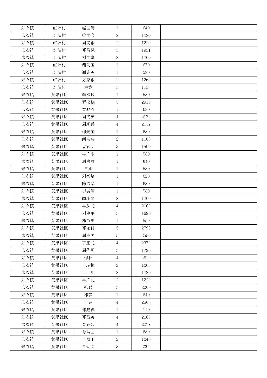 2025年11月份奉节县朱衣镇农村低保家庭保障金发放花名册