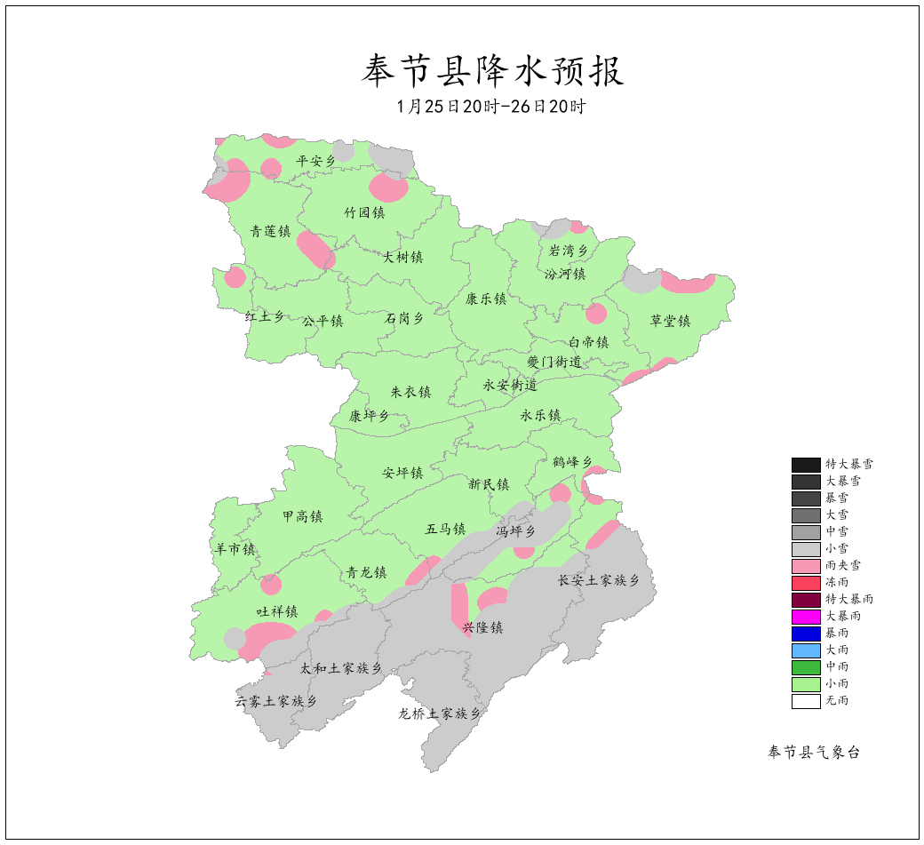 受北方冷空气影响,24日至26日我县将迎来降温降雨(雪)天气过程。22日夜间至24日白天,大部地区以降雨为主;24日夜间至26日白天,海拔800米以上地区有雨夹雪或小到中雪,主要降雪时段为24日夜间至25日夜间。冷空气影响时山口河谷地区有4~6级阵风。大部地区日平均气温将下降5~7℃,偏南偏北高海拔乡镇下降8~10℃;27日早上,大部地区最低气温将降至0~3℃,海拔800米以上地区将降至-2℃以下。